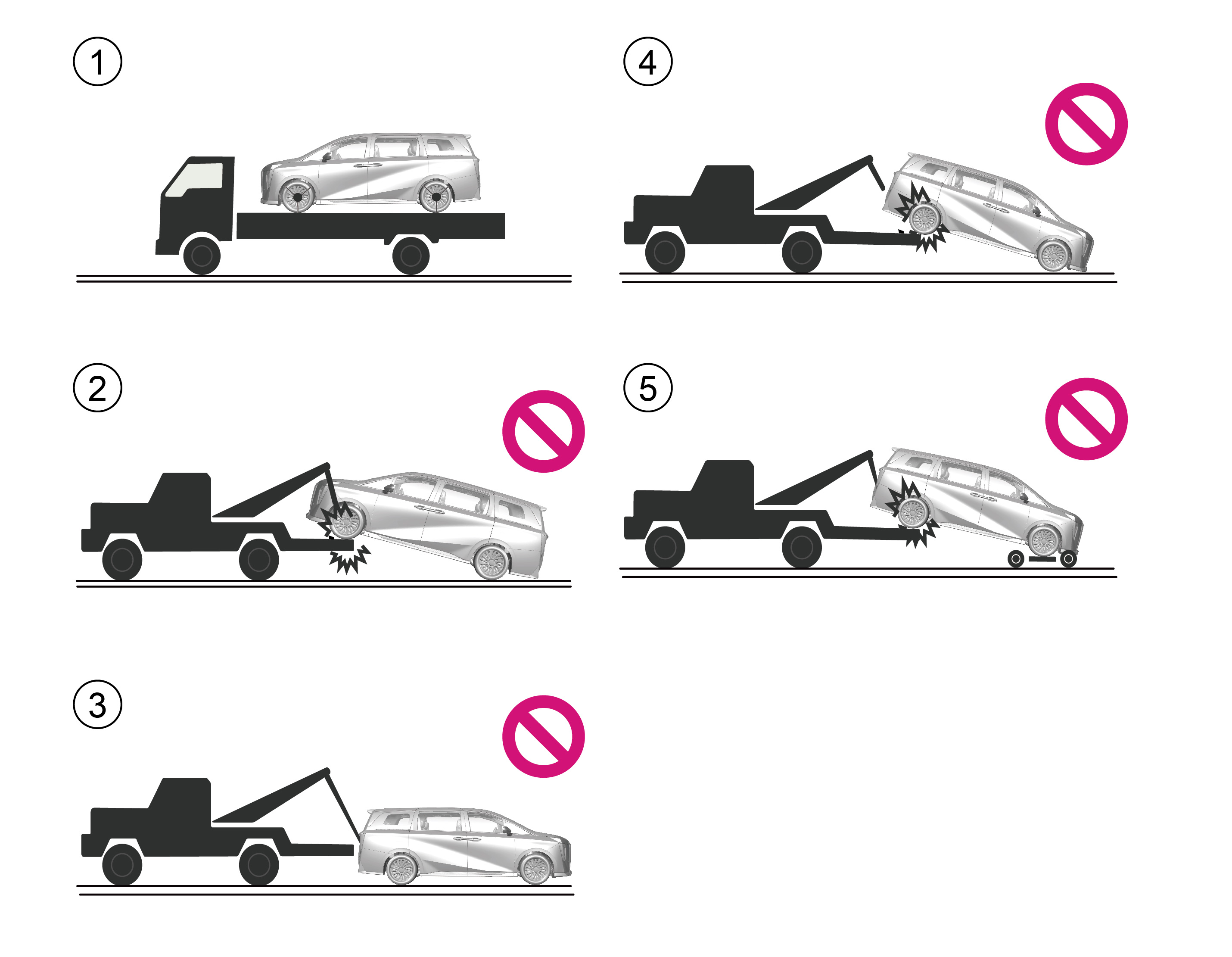 当车辆发生故障或事故导致车辆不能正常启动时,应采取图①平台式载货汽车的拖车方式撤离现场。