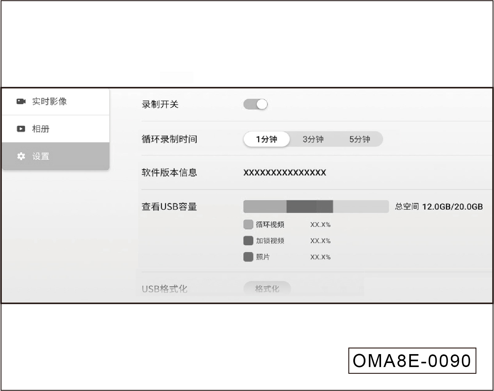 设置项中有录制开关、循环录制时间、软件版本信息、查看USB容量、USB格式化、移除USB等。