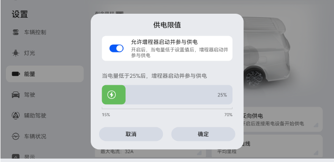 在中控屏进入“设置>能量”,点击“反向供电”,可以设置供电限值。进行反向供电时,动力电池电量低于设置值后,发动机启动并参与供电。