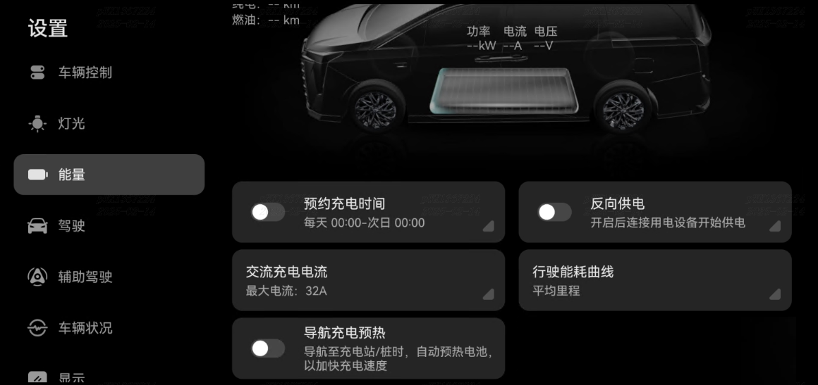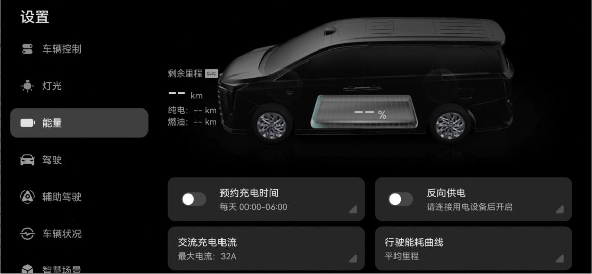 您可以在中控屏点触“设置 > 能量”,进入能量管理界面。