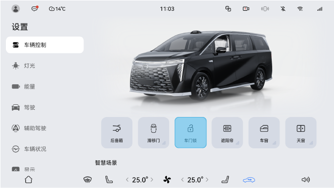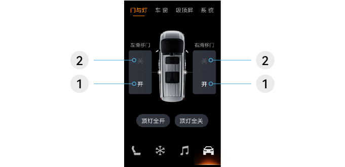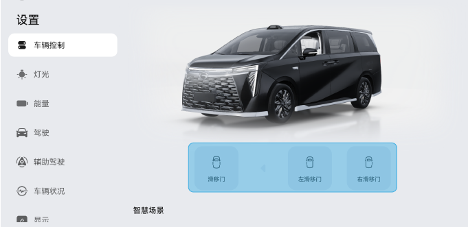 在中控屏进入“设置>车辆控制”,点击“滑移门”,可开启或关闭滑移门。