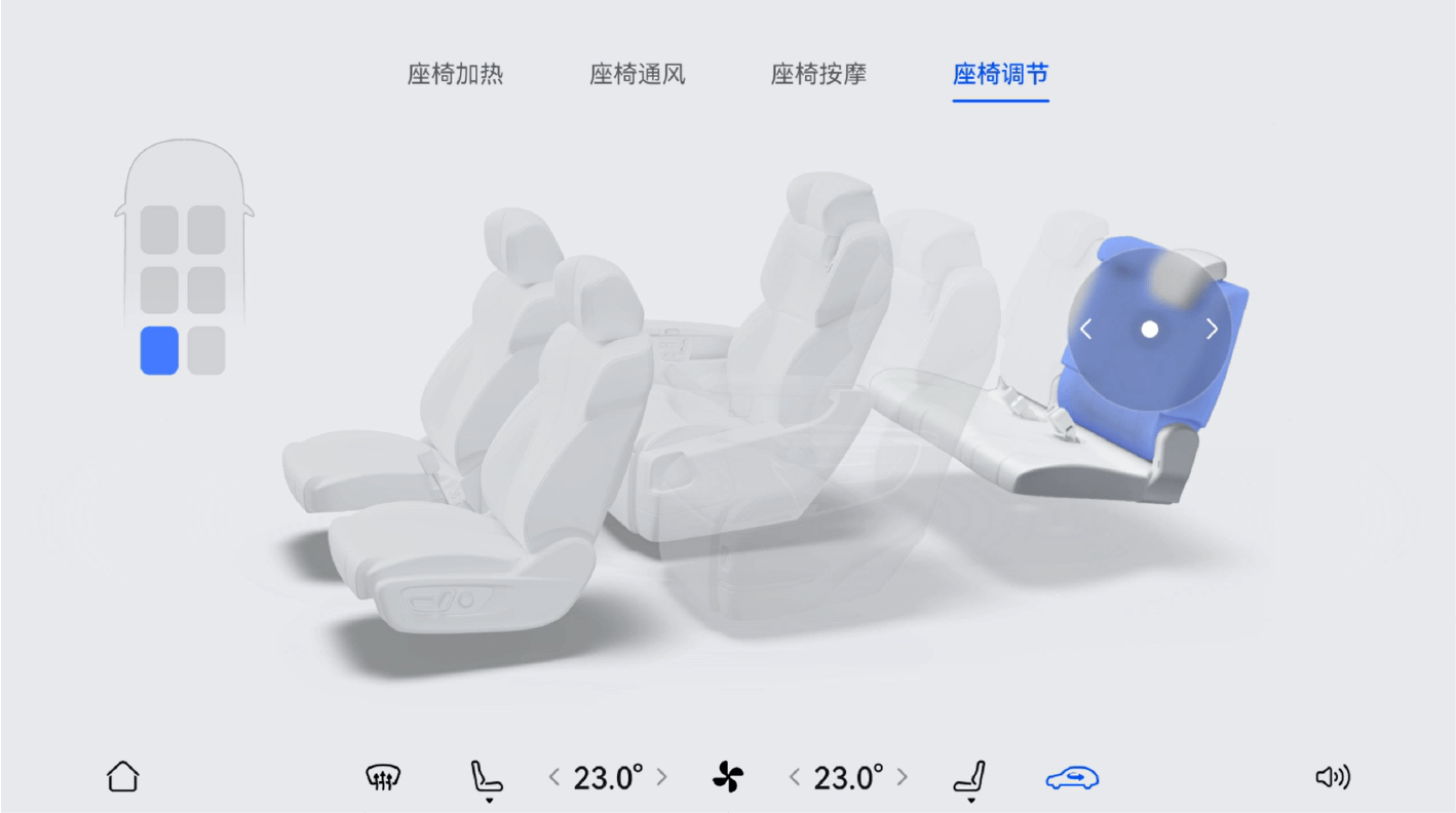 ,打开座椅控制界面。在座椅控制界面点击“座椅调节”切换至座椅调节界面。