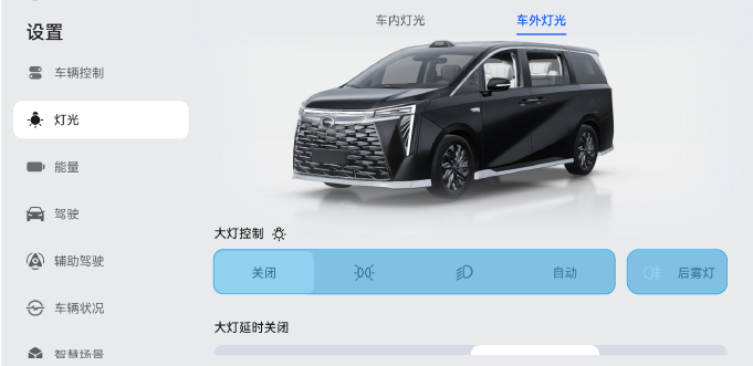 在中控屏进入“设置>灯光”,在车外灯控制菜单界面中点击各灯光控制按键来控制灯光。