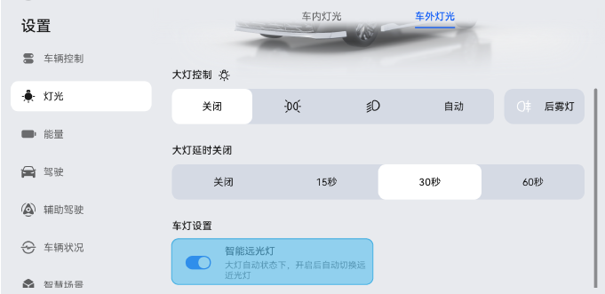 开启:在中控屏进入“设置>灯光>车外灯光>智能远光灯”,点击智能远光灯开启远近光灯智能切换功能。将灯光调节至AUTO挡,系统会结合当前行车环境状况,在近光灯与远光灯之间自动切换。