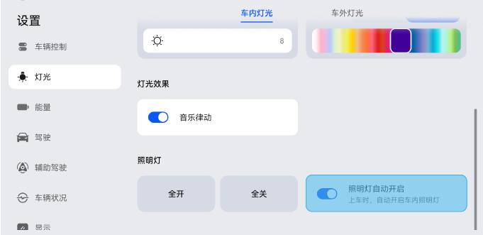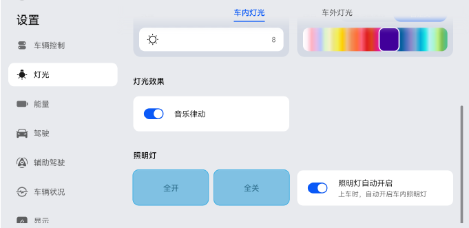 在中控屏进入“设置>灯光”,在车内灯光界面,选择“全开”或“全关”车内照明灯。