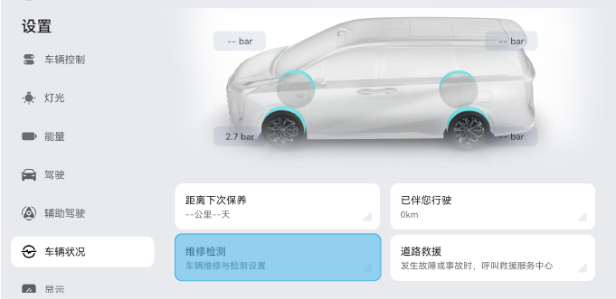 关闭雨刮功能,将挡位切换至P挡,然后在中控屏进入“设置>车辆状况>维修检测”,开启雨刮维修模式。
