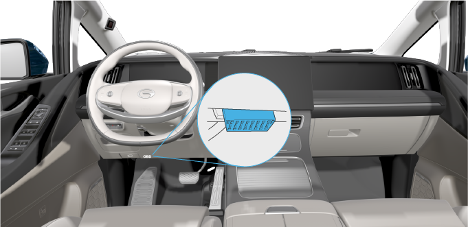 使用专用诊断仪中的OBD接头,连接到位于主驾仪表台底部的OBD诊断接口,诊断仪可从车辆中读取VIN码。