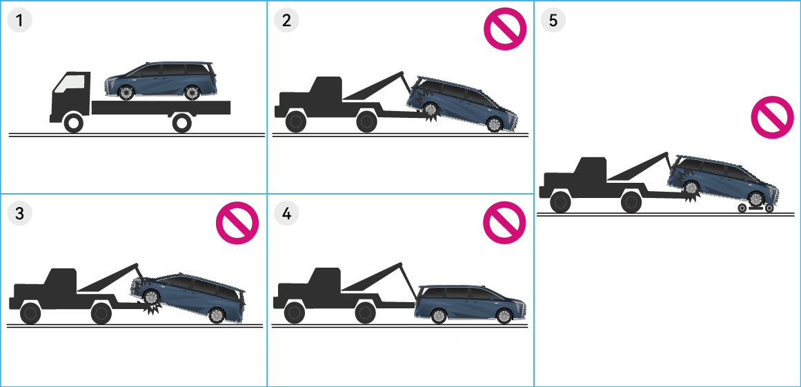 牵引车辆时需使用①的牵引方式,禁止使用如上中②③④⑤的牵引方式。