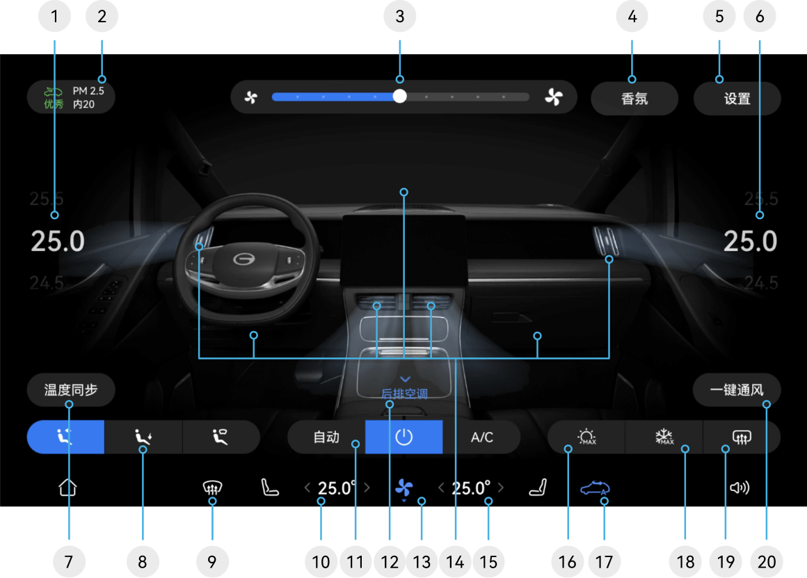 点触“后排空调”后,切换成后排空调调节视角。 |