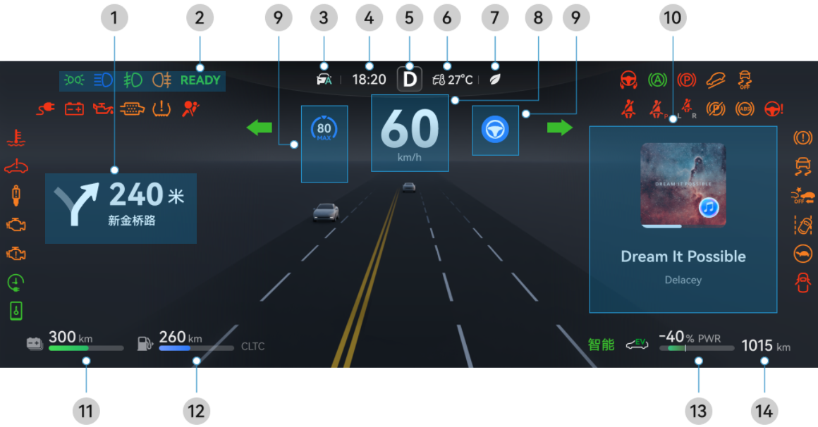 显示导航信息、能量流动、胎压信息、里程信息、功率曲线