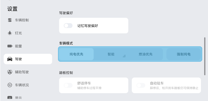 若要记忆当前车辆驱动模式,可在中控屏进入“设置>驾驶”,打开记忆驾驶偏好开关,即可在下次启动车辆时默认当前车辆驱动模式。