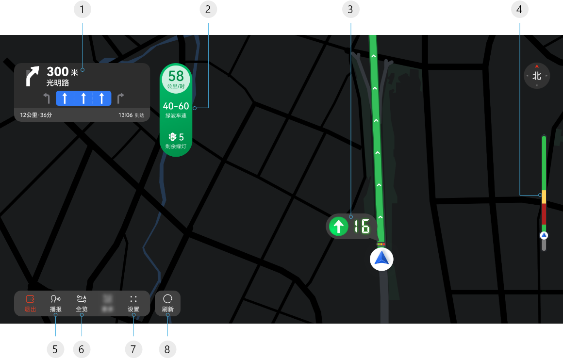 当处于导航态时,中控屏上显示引导面板、路况、红绿灯倒计时等导航信息