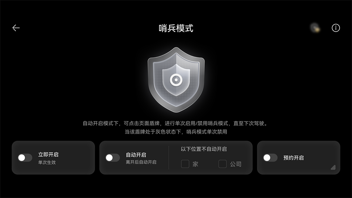 自动开启:启用后,车辆会在驾驶员离开车辆并锁车时,约 1 分钟内自动开启哨兵模式。自动开启长期生效,驾驶员无需每次手动开启。若车辆中控屏中已经设置了“家”、“公司”两个常用地点的地址,则驾驶员还可以设置在这两个位置不自动开启哨兵模式,以减少电量与车辆组件寿命消耗。