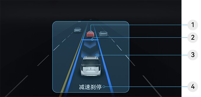 下图以车辆意图减速刹停为例,说明 ADS 意图相关的画面和文字元素。