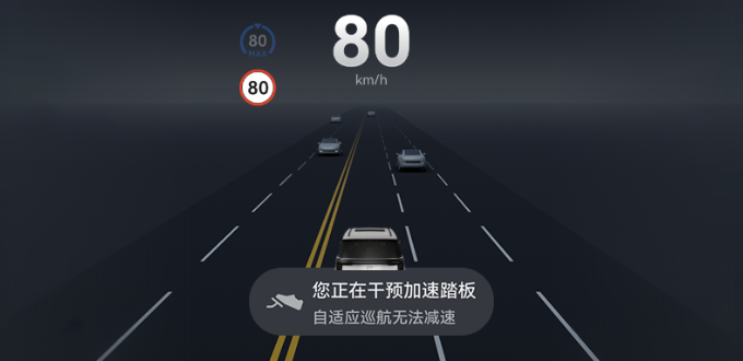 长时间干预加速踏板会导致仪表屏和声音提示逐步升级,若干预加速踏板超过规定时长或加速到车速超过 135 km/h 会导致 ACC 退出。退出 ACC 前,系统会发出连续告警音,并升级弹窗和语音播报。此时,驾驶员应立即轻踩刹车,人工接管车辆。