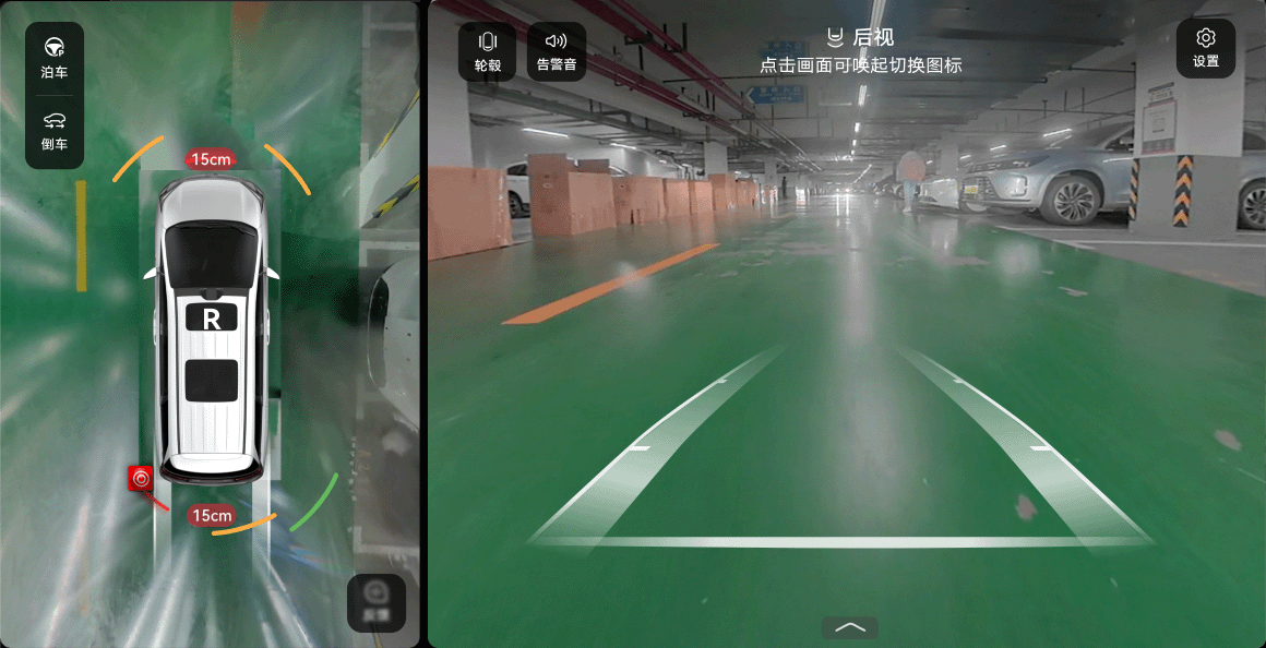 车机仪表屏和中控屏会根据车辆与障碍物的不同距离,呈现不同颜色的障碍物告警曲线和告警提示音: