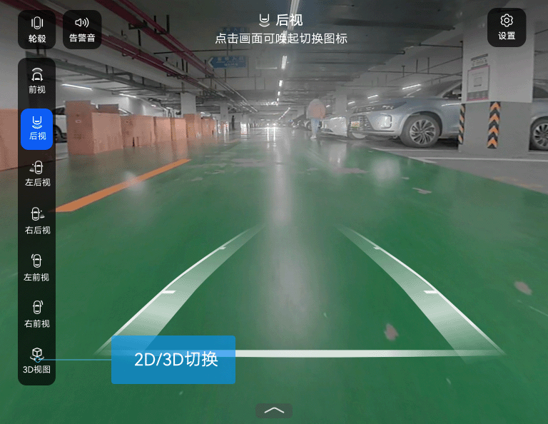 ,可开启或关闭障碍物告警提示音。点触右侧影像区域,可打开多视角图标切换栏,具体包括:2D