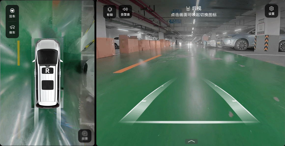 挂 R 挡(请确认中控屏的“设置 > 辅助驾驶 > 全景环视”已设置了挂 R 挡默认打开 “360° 全景环视”)。