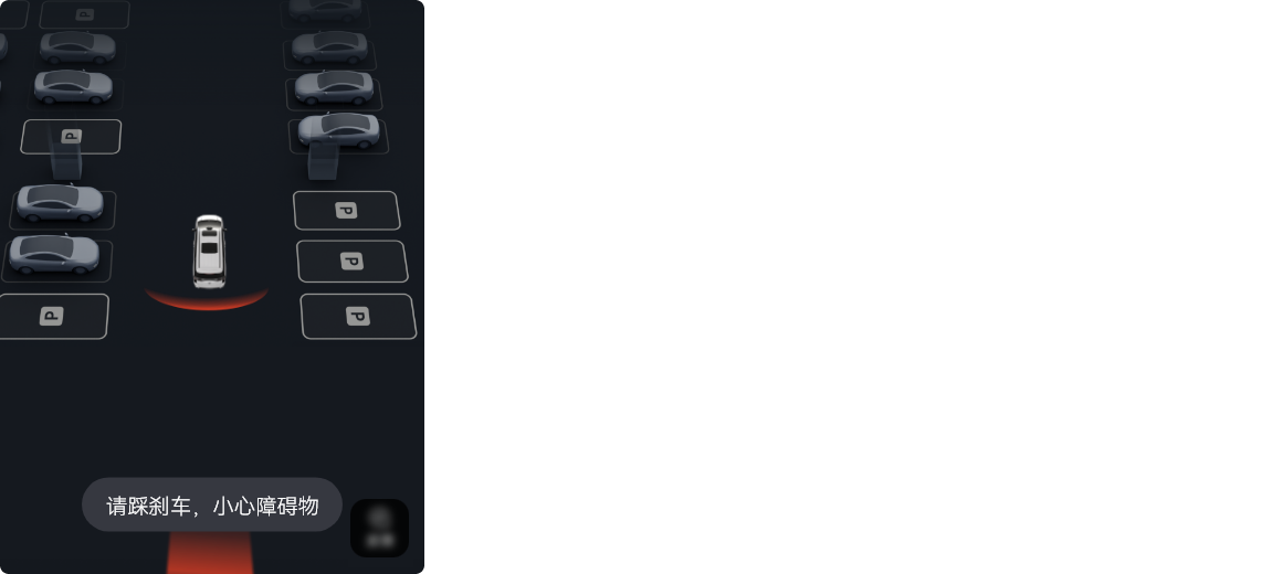 实施 RAEB 时,中控屏上会在自车后方显示动态红色弧线,并将风险目标红色高亮显示,伴有“请踩刹车”的文字提示,提醒驾驶员采取制动措施。