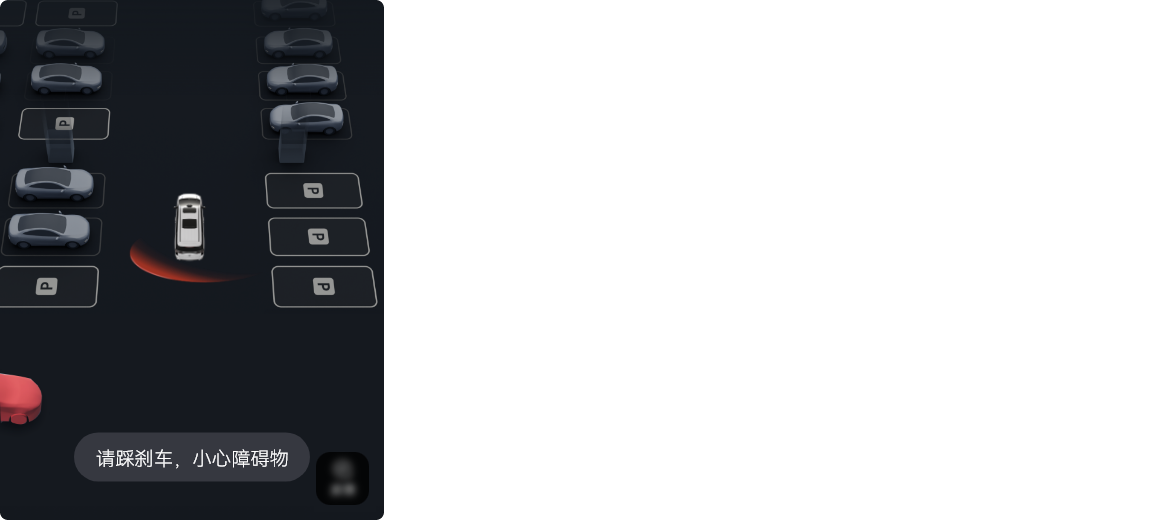 实施 RCTB 时,中控屏上会在自车侧后方来车方向显示动态红色弧线,并将风险目标红色高亮显示,伴有“请踩刹车”的文字提示,提醒驾驶员采取制动措施。