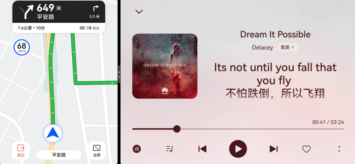 分屏状态下,点触导航窗口内“全屏”,或在音乐等应用界面边缘向内滑动,即可回到全屏导航。