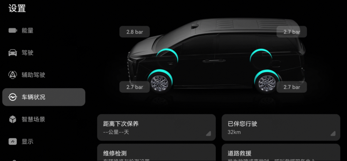 在中控屏进入“设置 > 车辆状况”,查看胎压信息。