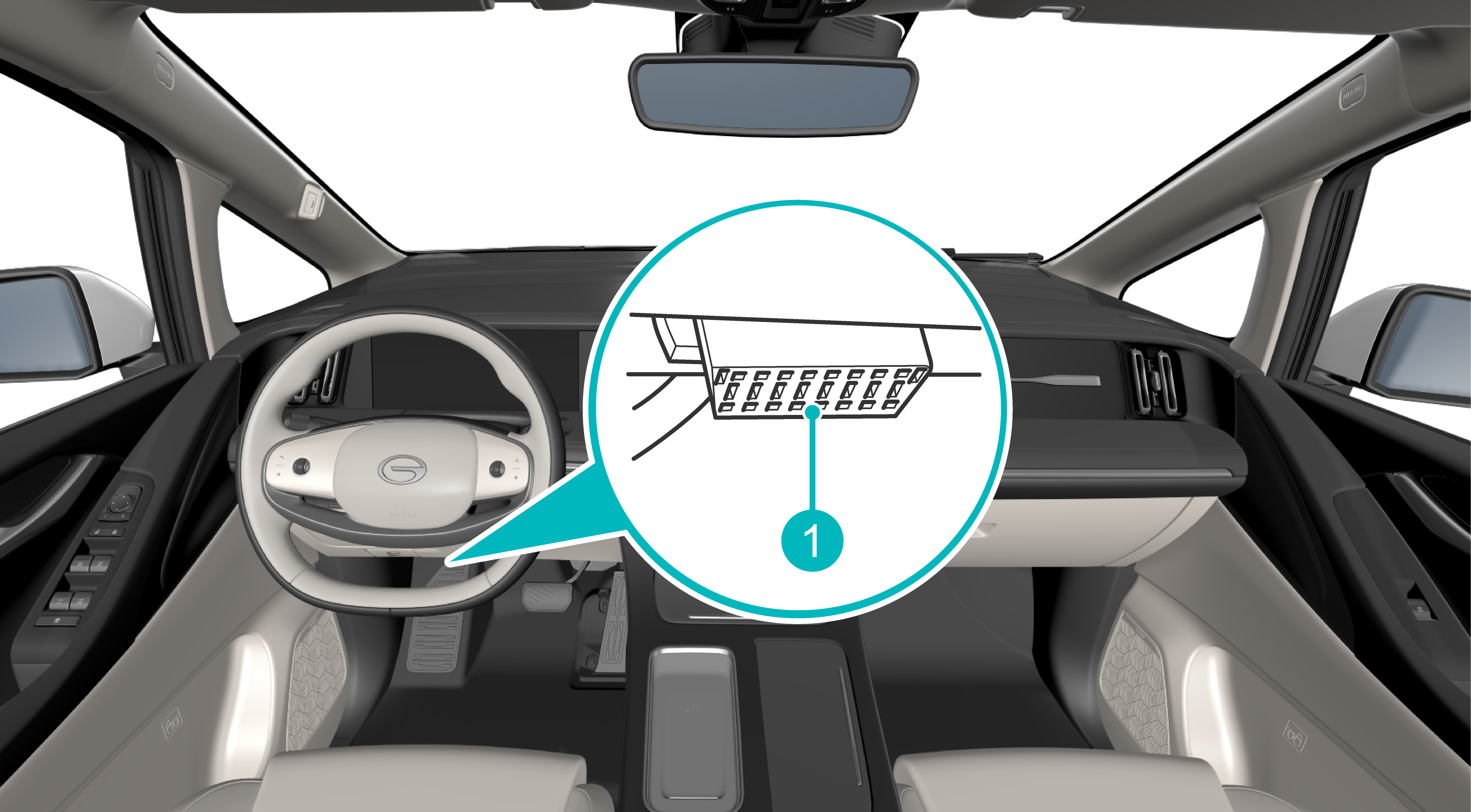 读取电子VIN码的OBD接口①位于仪表台左下方,通过专用诊断仪可以读取电子VIN码及车辆状态信息等数据。