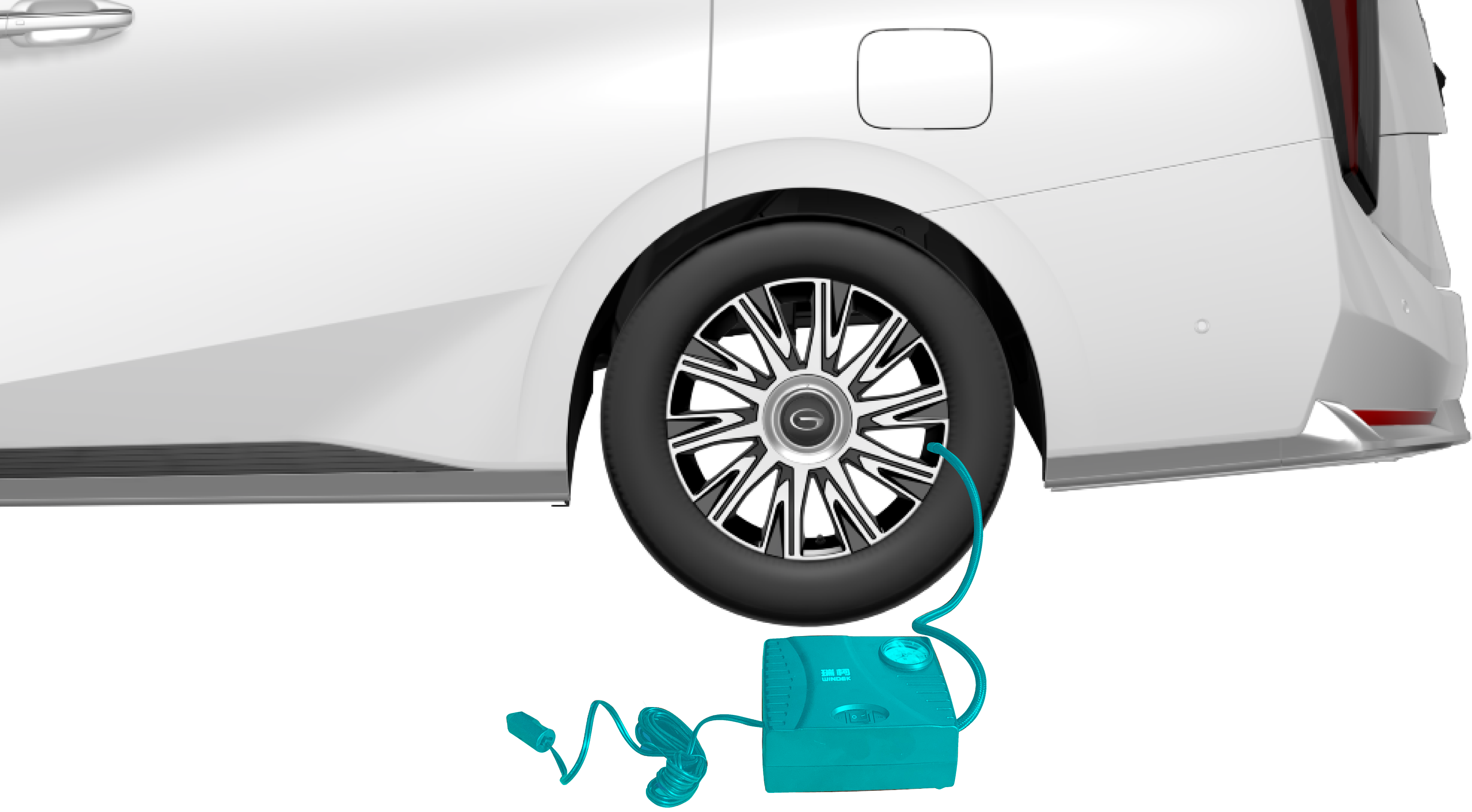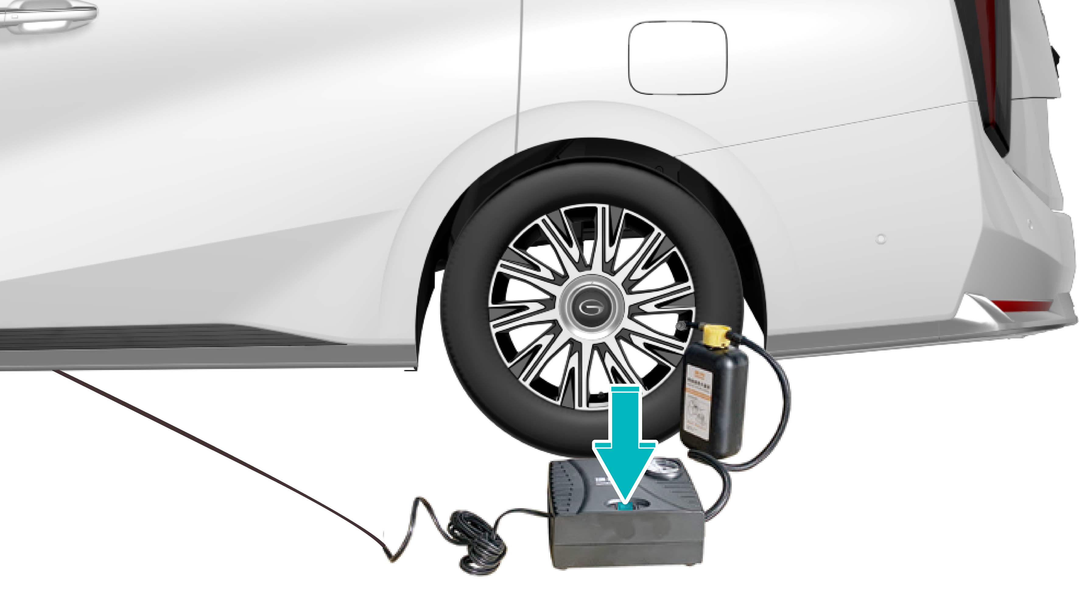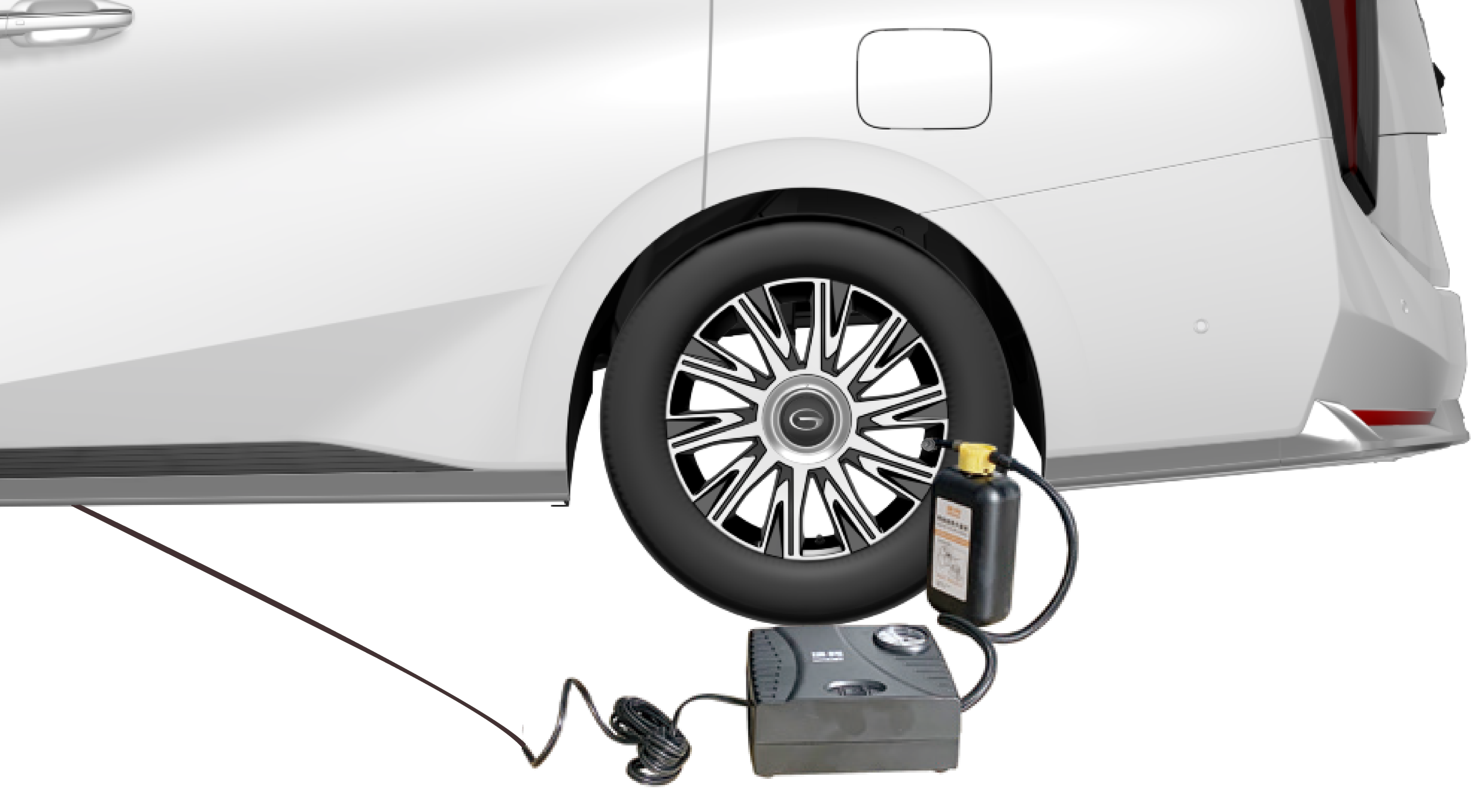 从行李箱内取出轮胎自动充气泵。