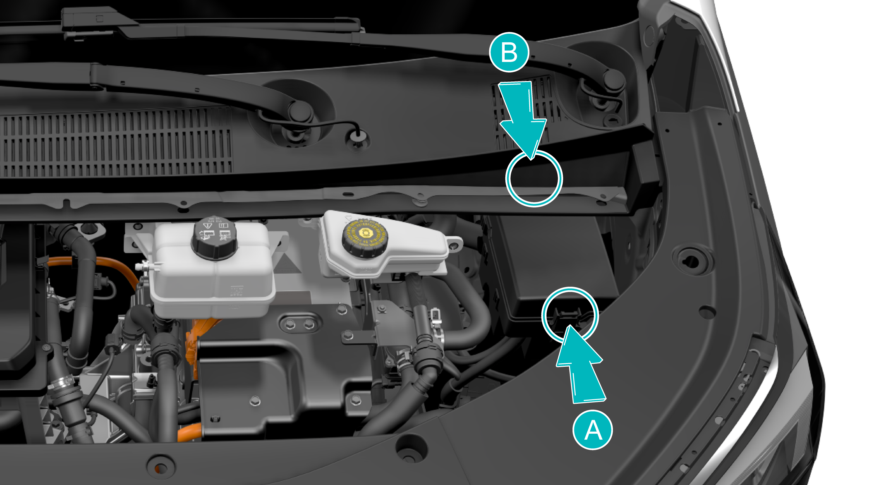 打开前机舱盖,在左车轮处找到线束保险盒,沿-箭头A-和-箭头B-方向按压固定卡扣完全解锁,然后掀起盖子。
