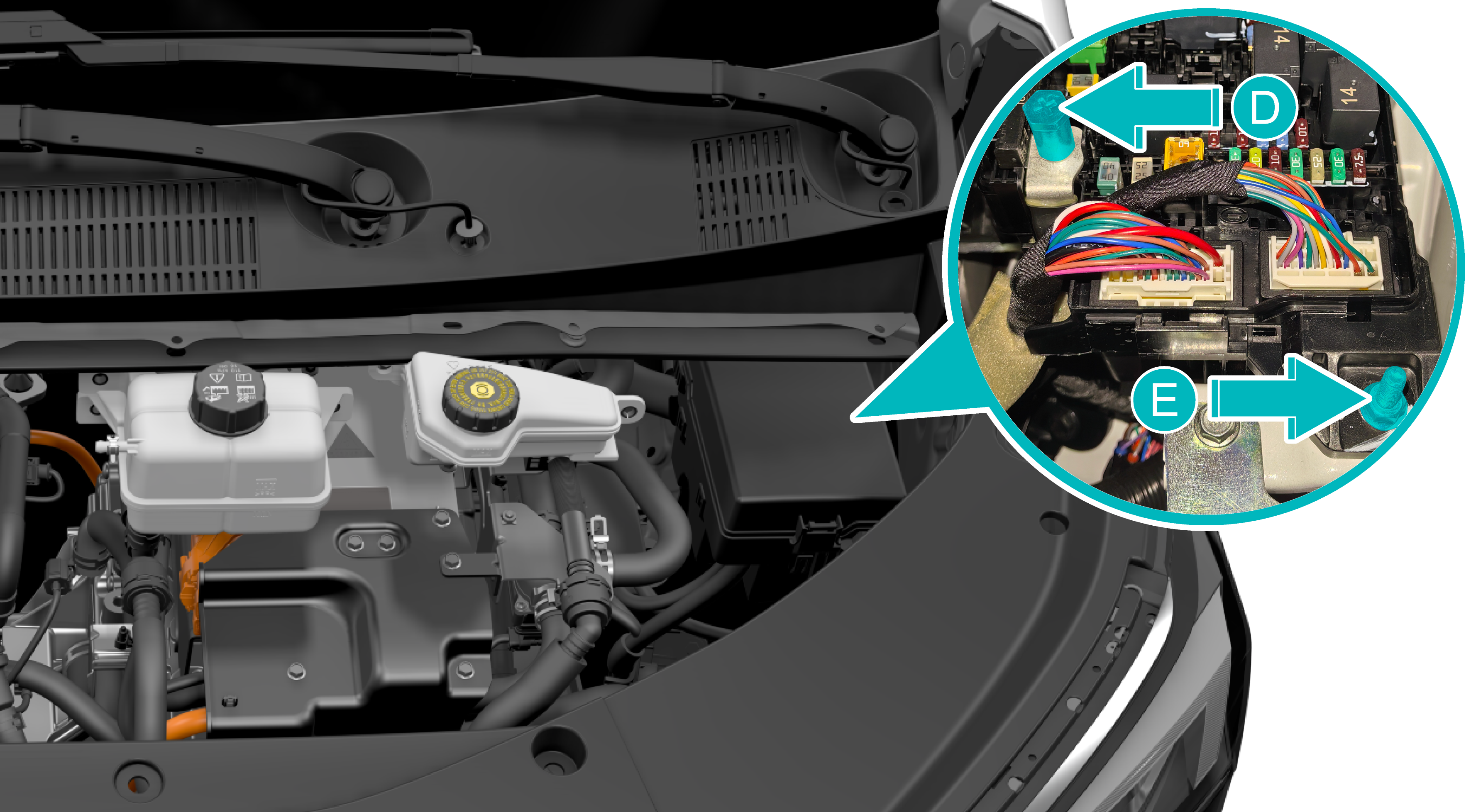 将正极跨接电缆的卡夹连接至本车专用跨接启动端子-箭头D-,另一端接另一辆车辆低压蓄电池正极。将负极跨接电缆的卡夹连接至本车的-箭头E-,另一端接另一车辆的低压蓄电池负极。