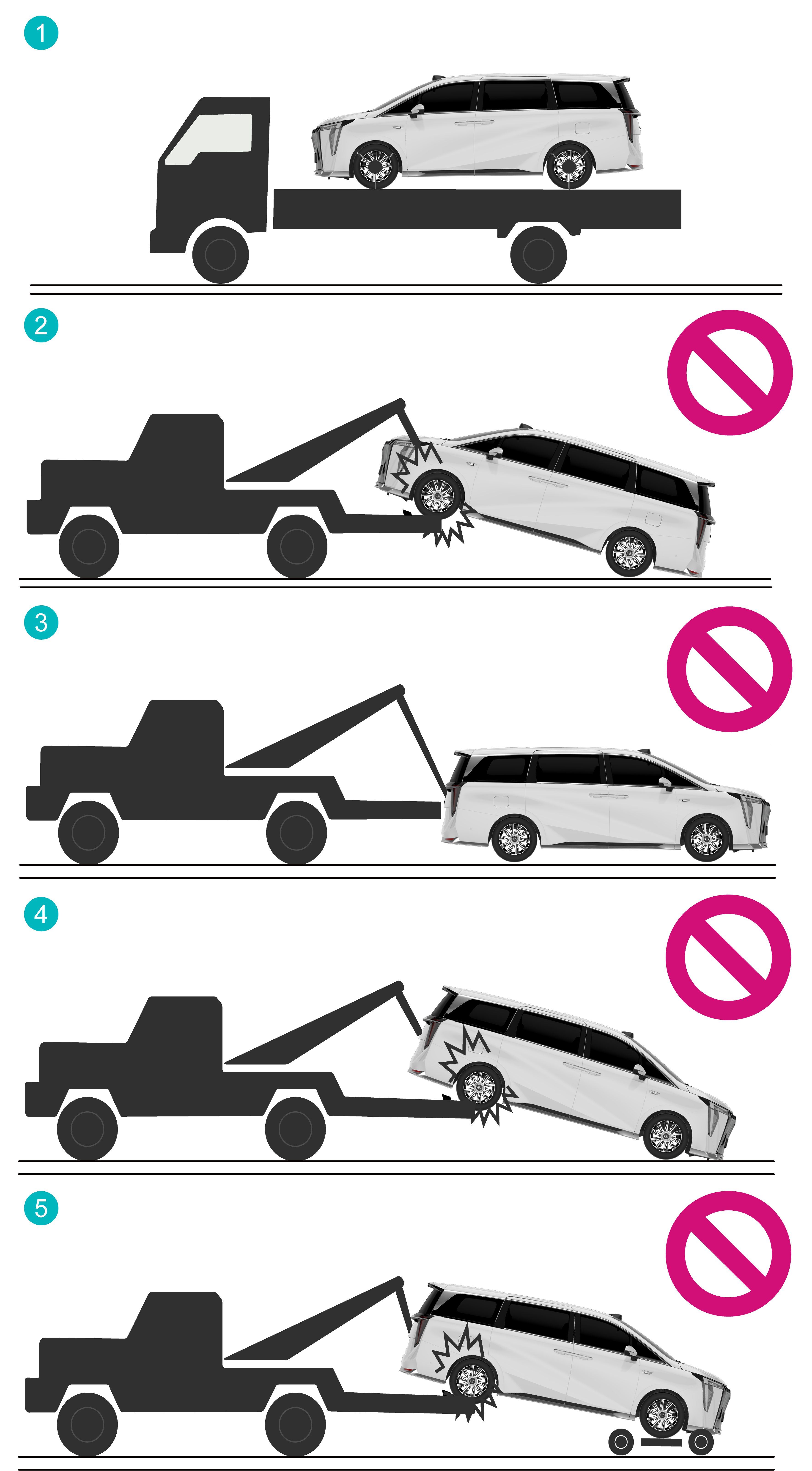 当车辆发生故障或事故导致车辆不能正常启动时,应采取图①平台式载货汽车的拖车方式撤离现场。