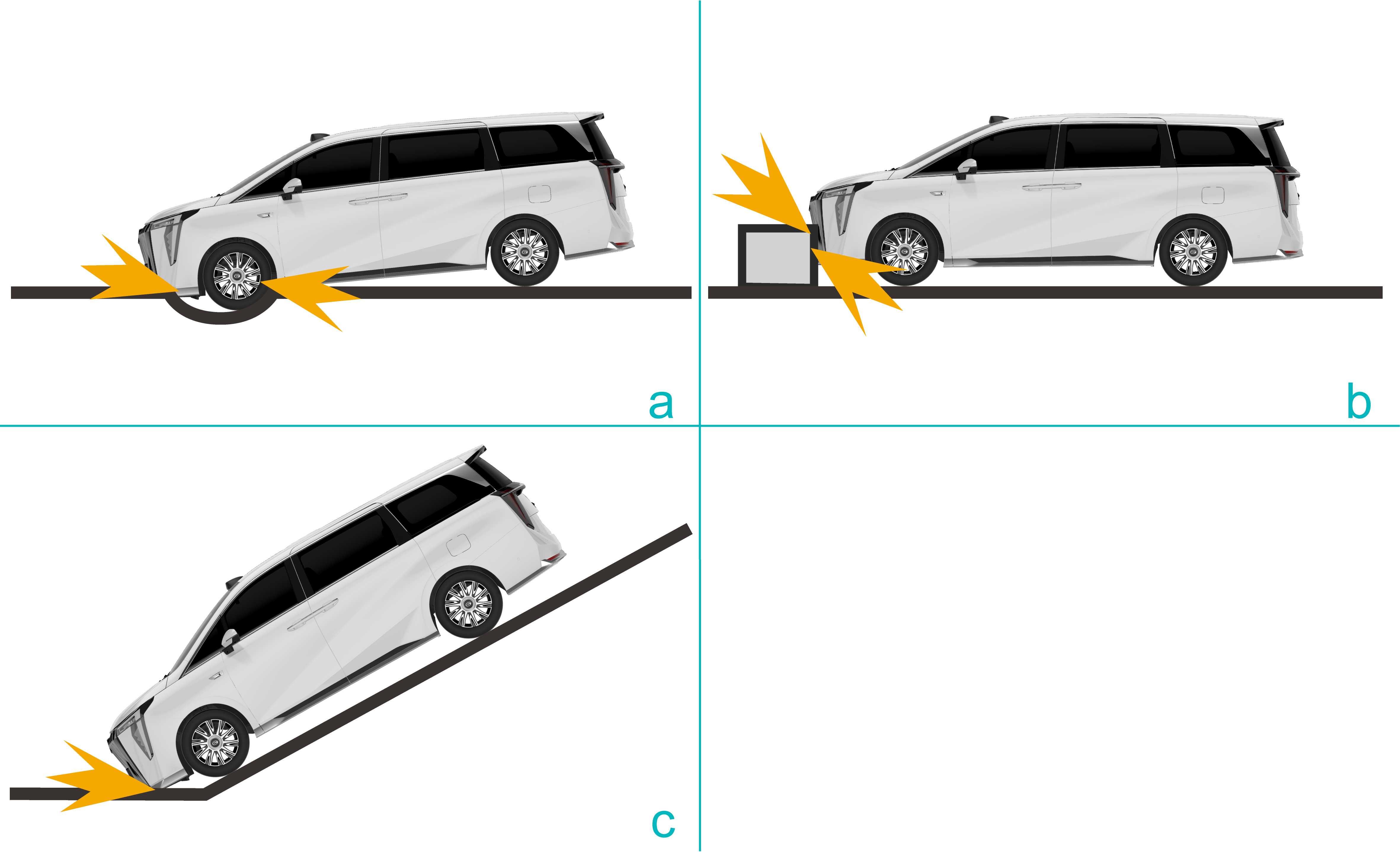 a.越过较深凹槽时,车头撞击地面。