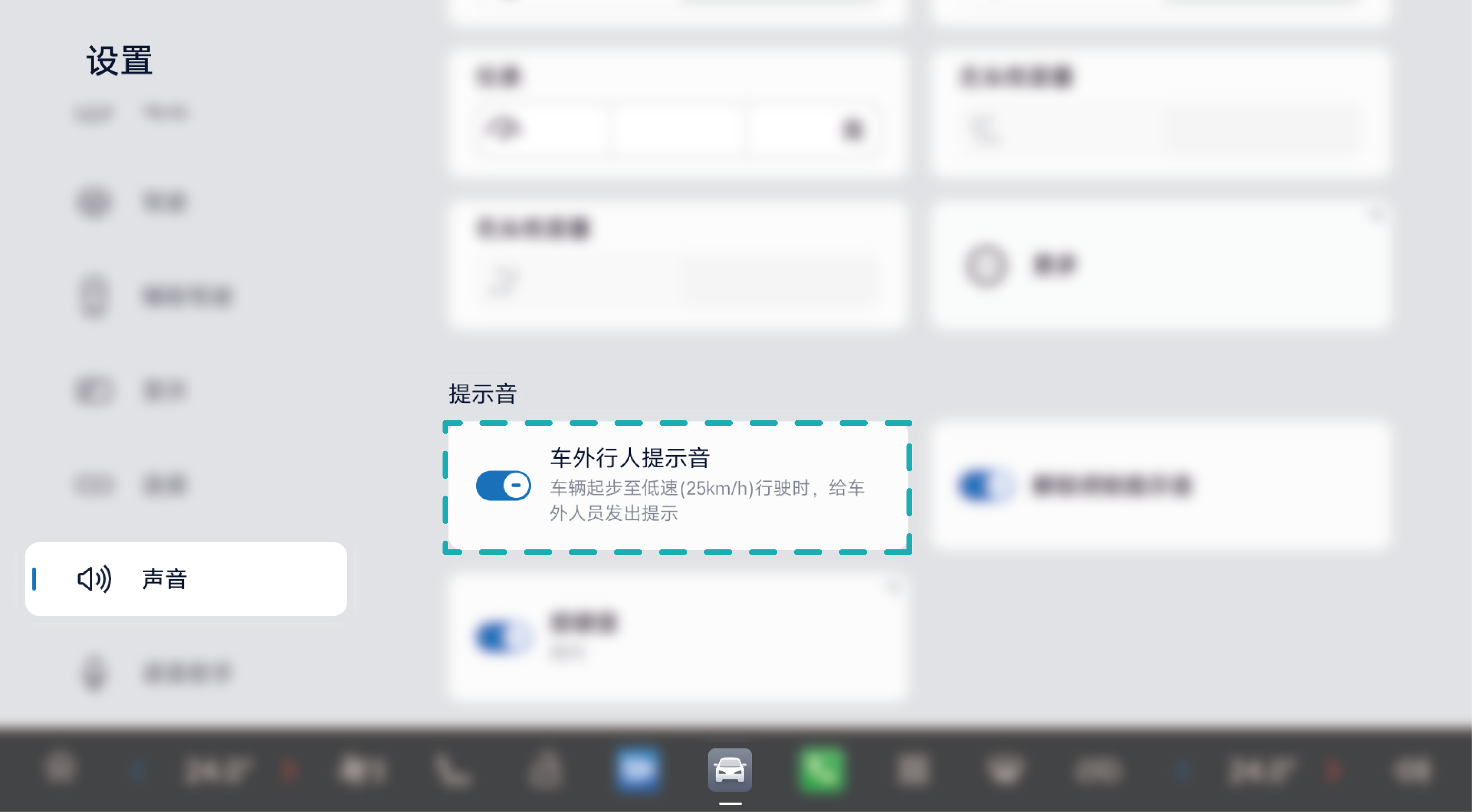 启动车辆后,车外行人提示音默认开启,可在中控屏进入“设置>声音”关闭车外行人提示音。