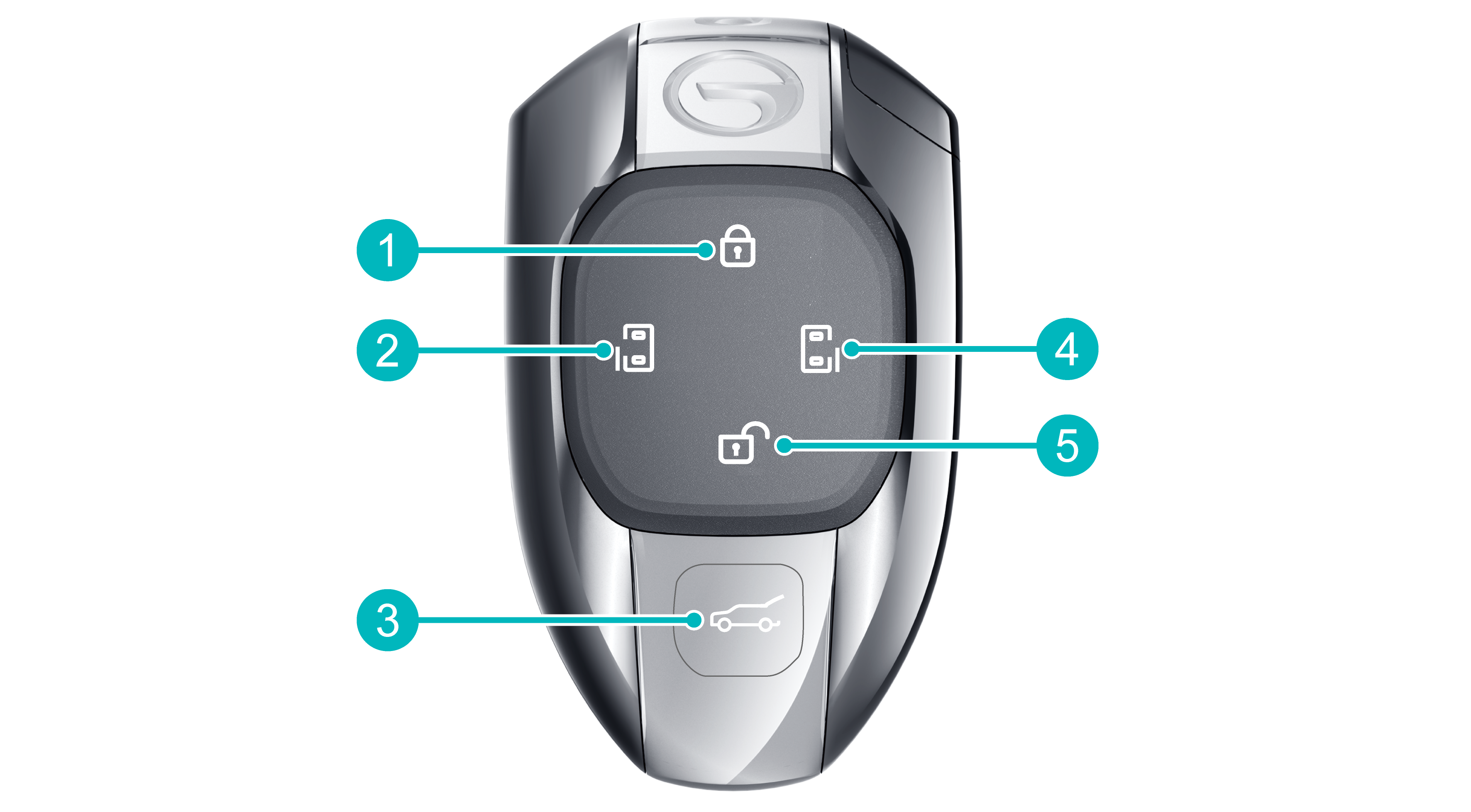 在有效范围内短按该按键1次,所有车门将被解锁;长按该按键四门车窗自动打开、天窗自动起翘。车窗打开过程中,若松开该按键,车窗停止打开。