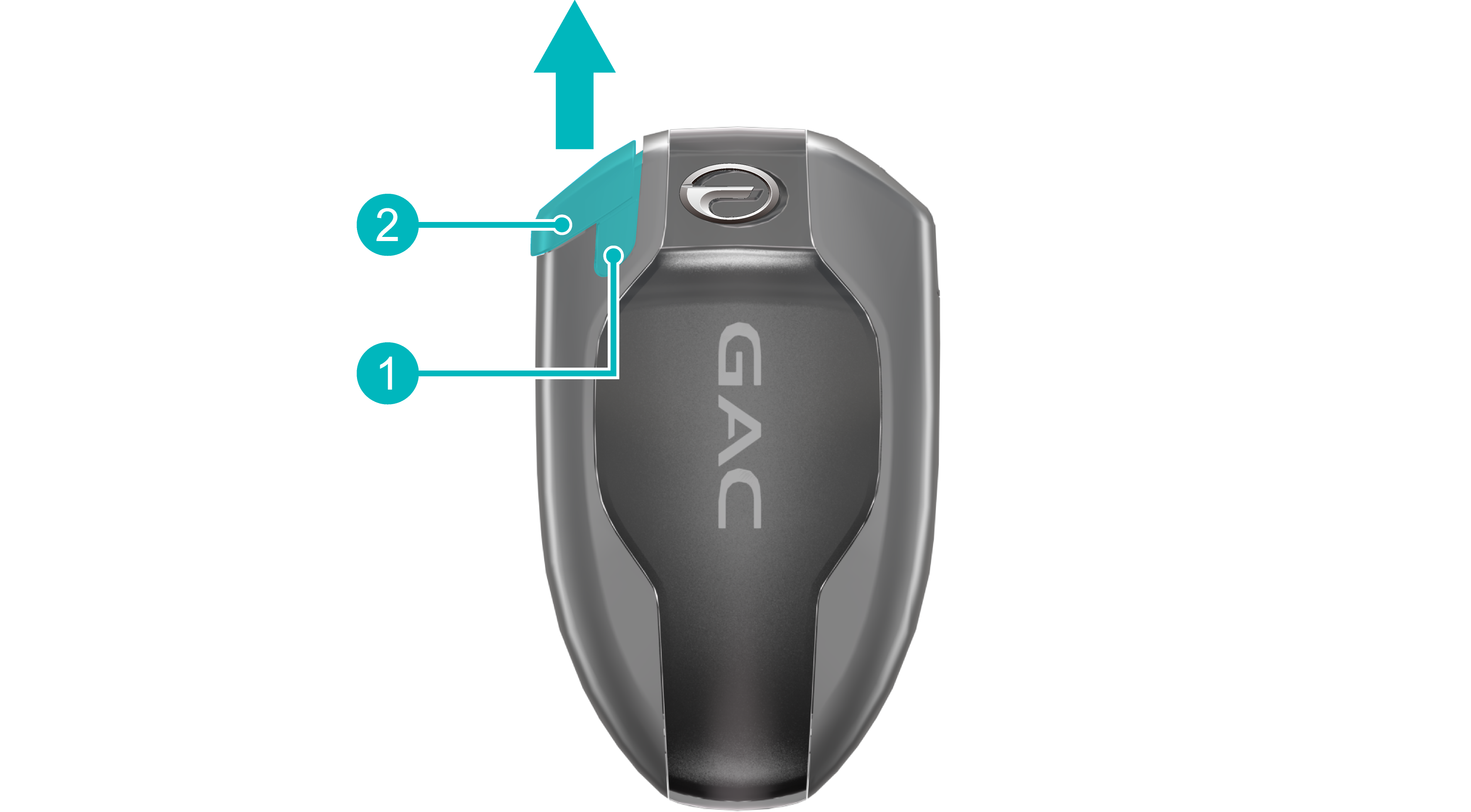 按压锁止按键①,同时沿-箭头-方向取出应急机械钥匙②。