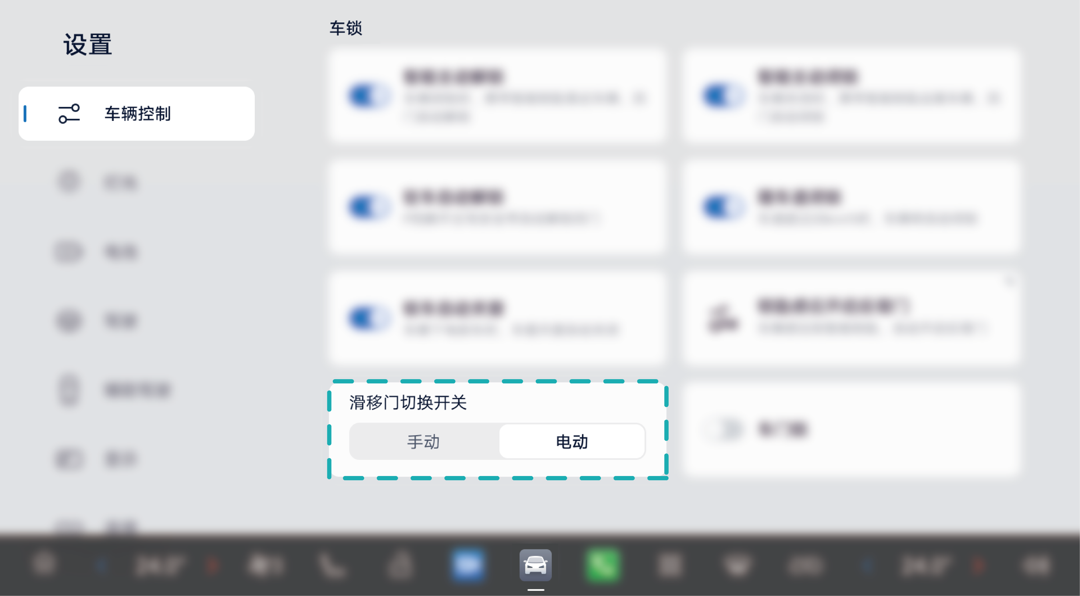 在中控屏进入“设置>车辆控制>车锁”可设置滑移门开启方式为手动或电动。