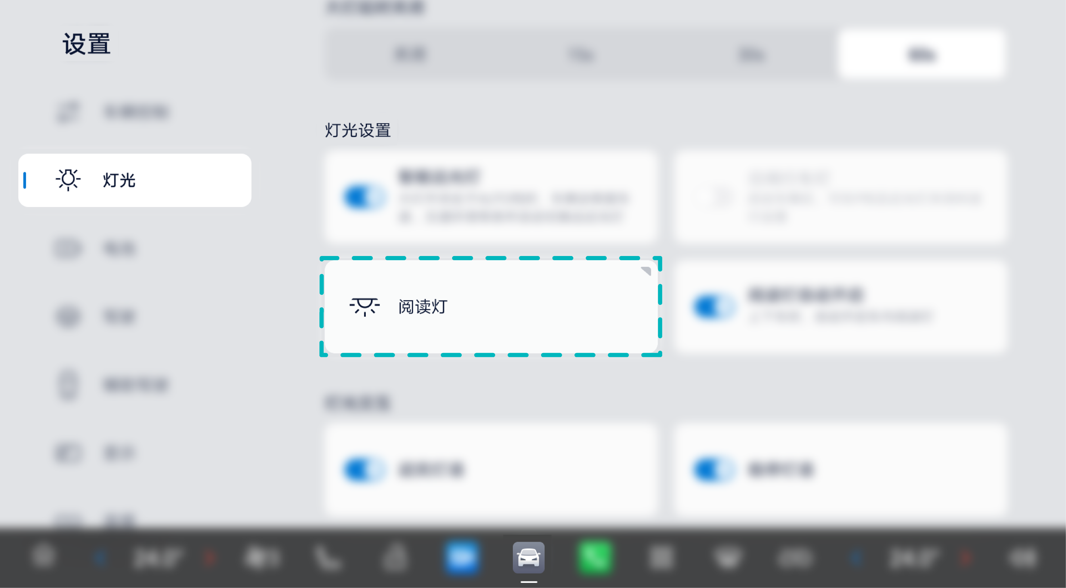 在中控屏进入“设置>灯光>阅读灯”,选择“全开”或“全关”车内照明灯。