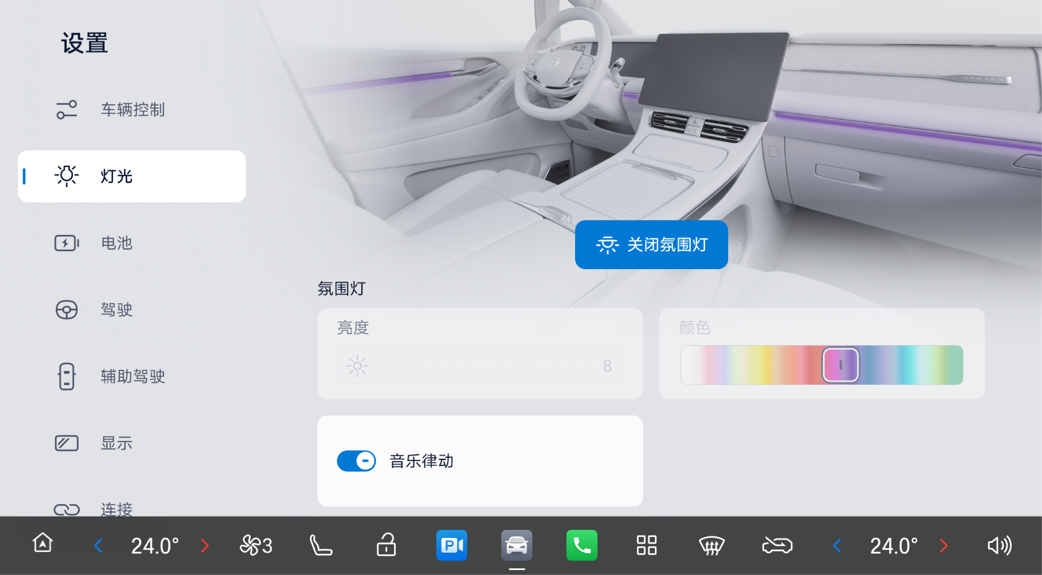 氛围灯开启后,您可以根据个人喜好设置氛围灯。
