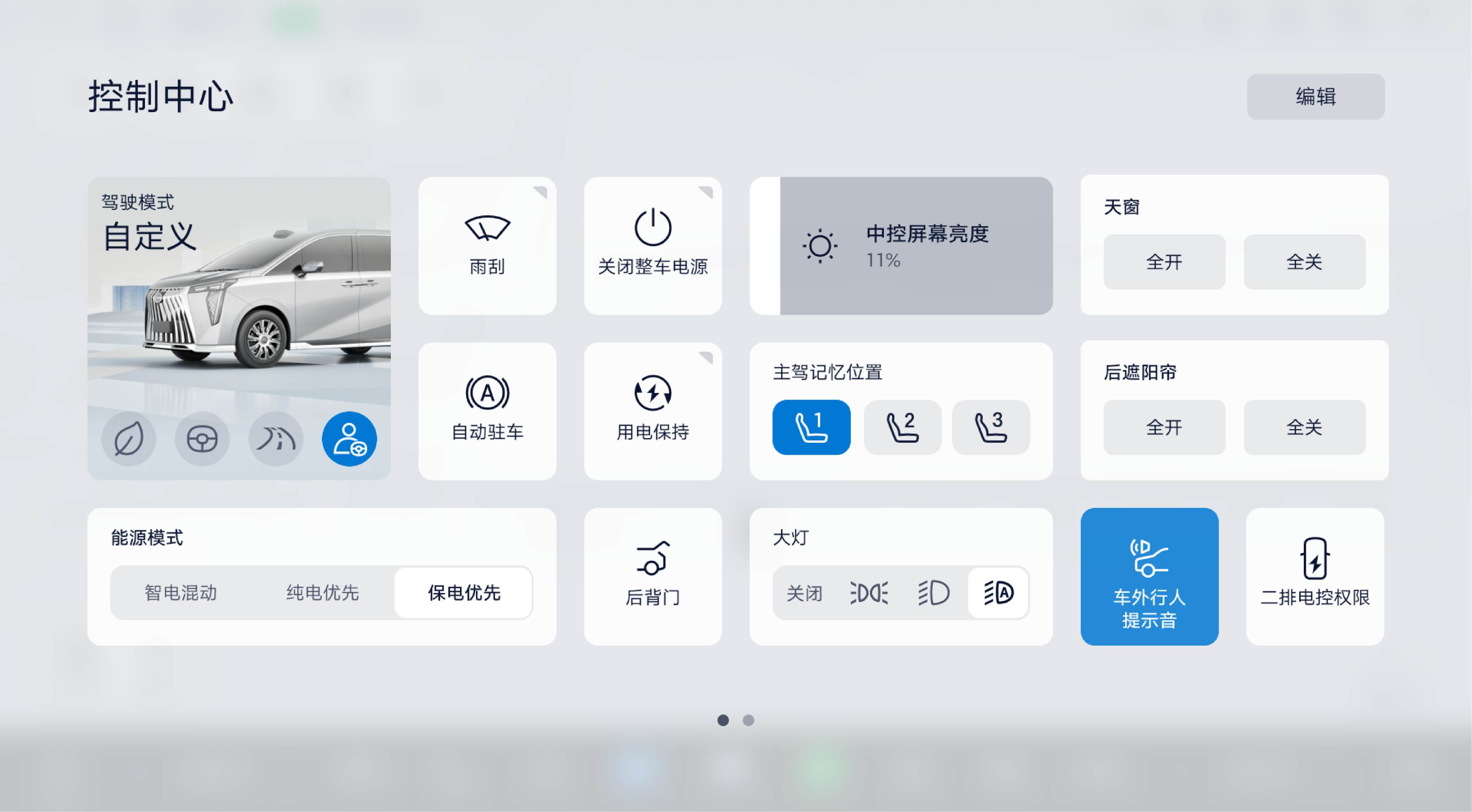 您可以通过控制中心快捷控制各项功能设置,包含:切换驾驶模式、调节亮度、开闭遮阳帘、开关儿童锁、开闭后背门等。