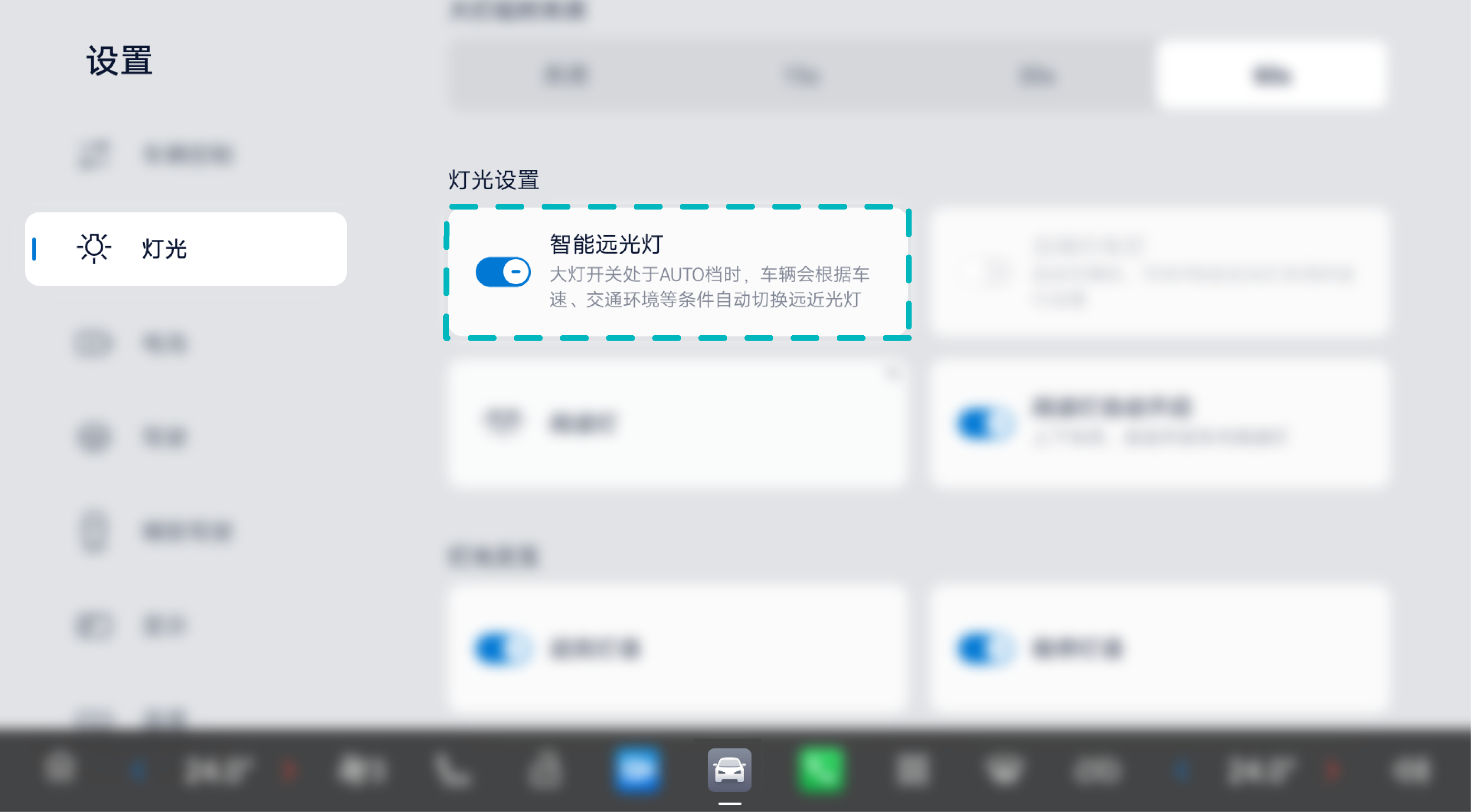 在中控屏进入“设置>灯光>灯光设置”界面,设置开启或关闭智能远光灯。