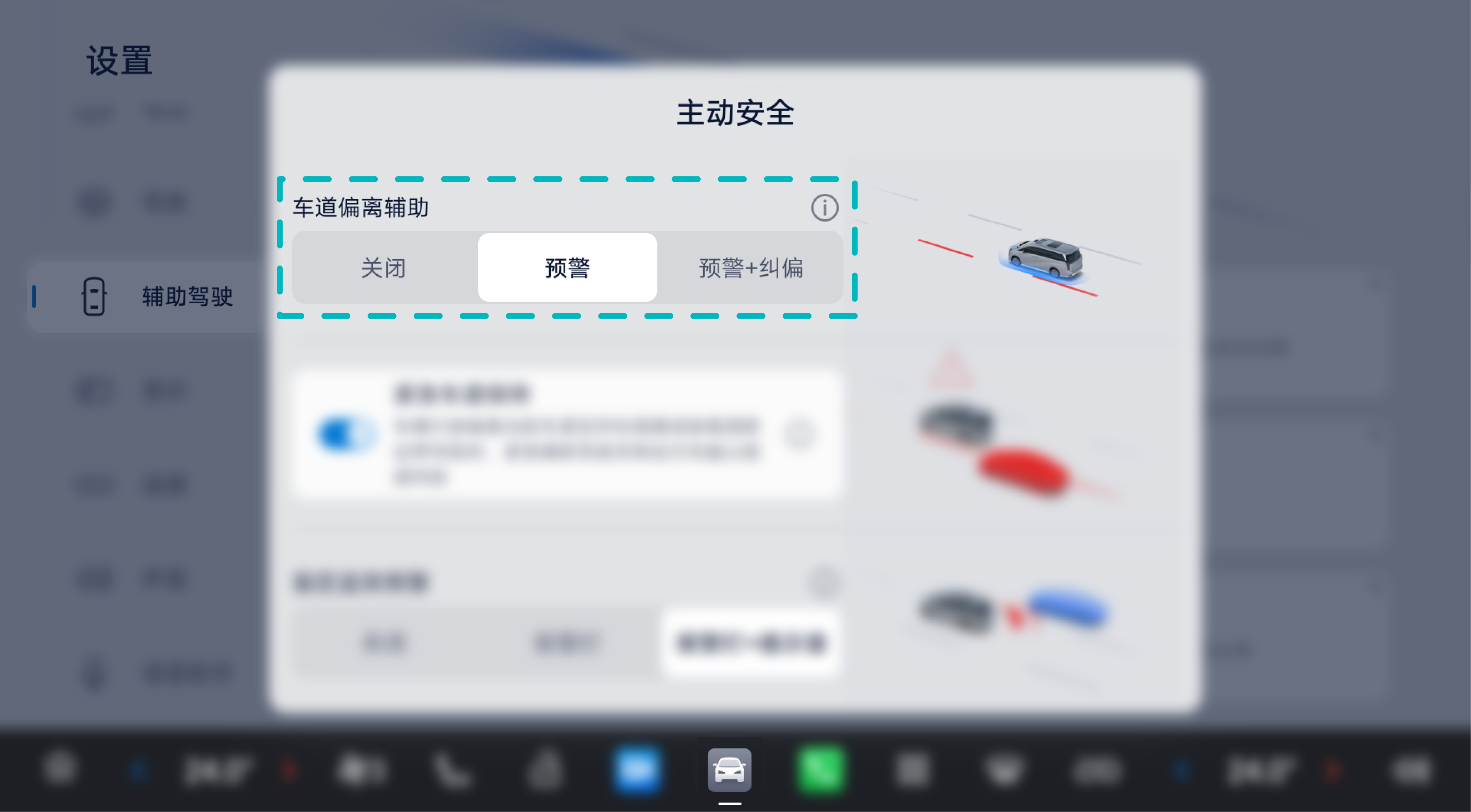 在中控屏进入“设置>辅助驾驶>主动安全”,设置开启或关闭车道偏离辅助功能。