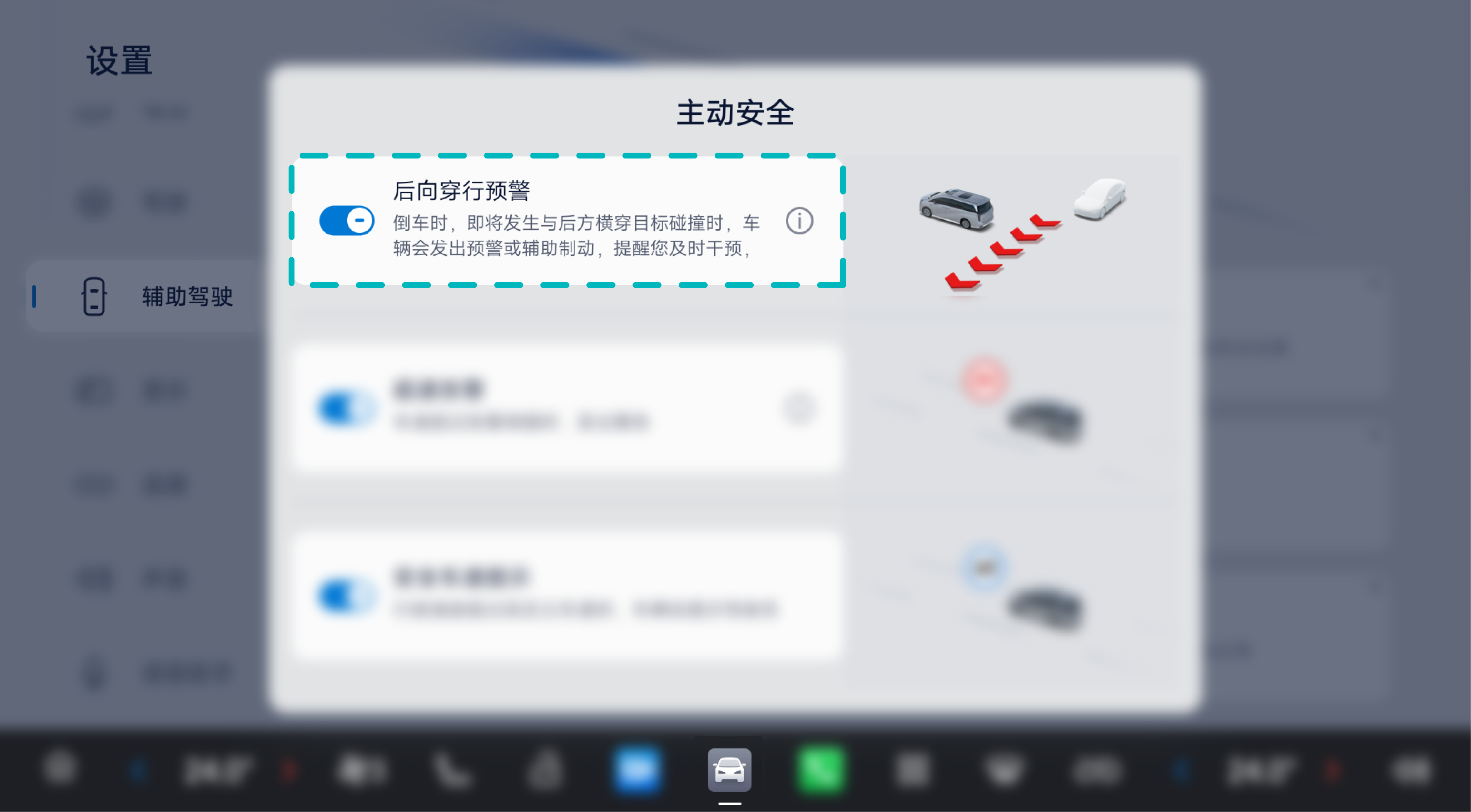 在中控屏进入“设置>辅助驾驶>主动安全”,可设置开启或关闭后向穿行预警系统。