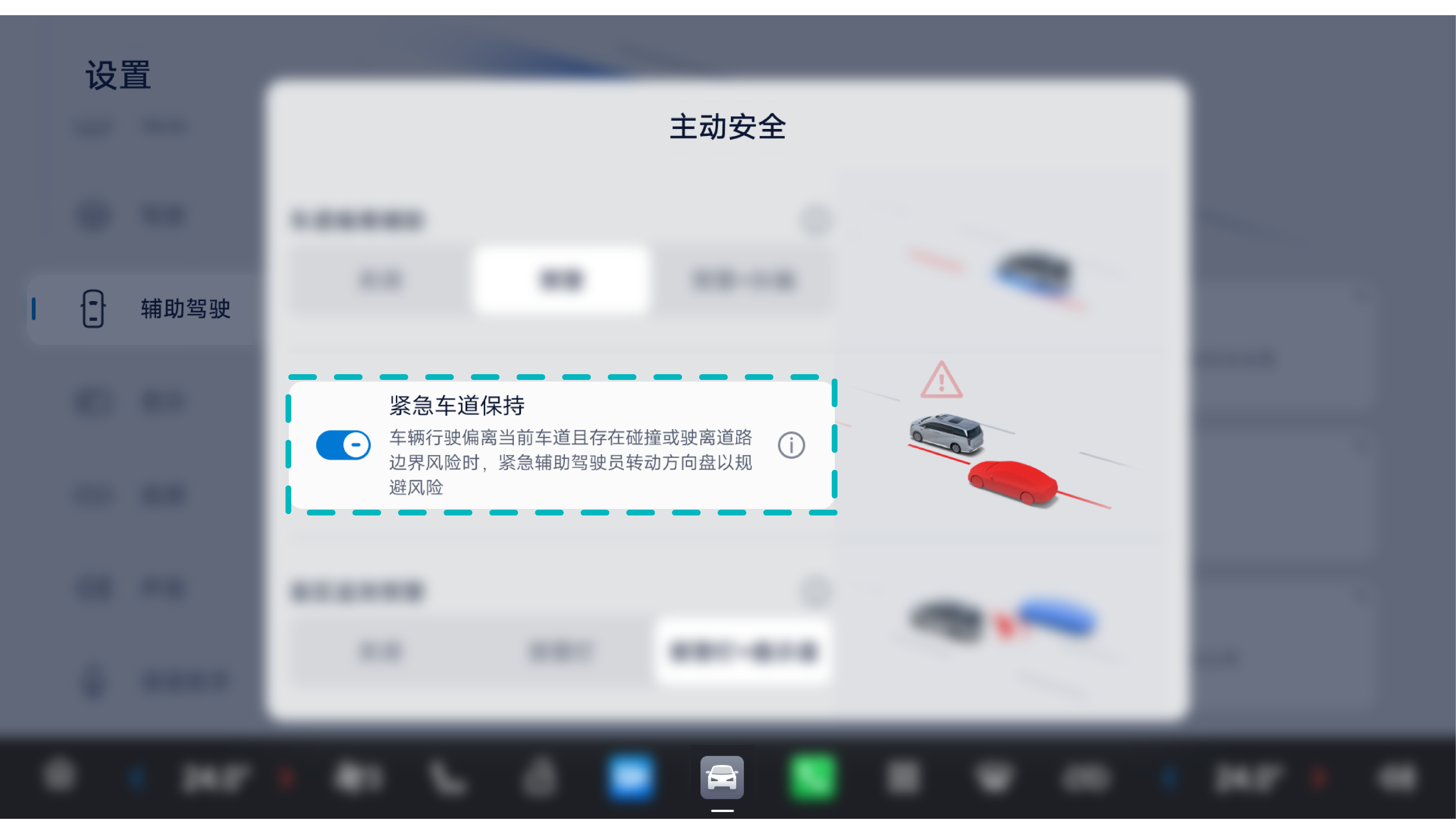 在中控屏进入“设置>辅助驾驶>主动安全”,可设置开启或关闭紧急车道保持辅助系统。
