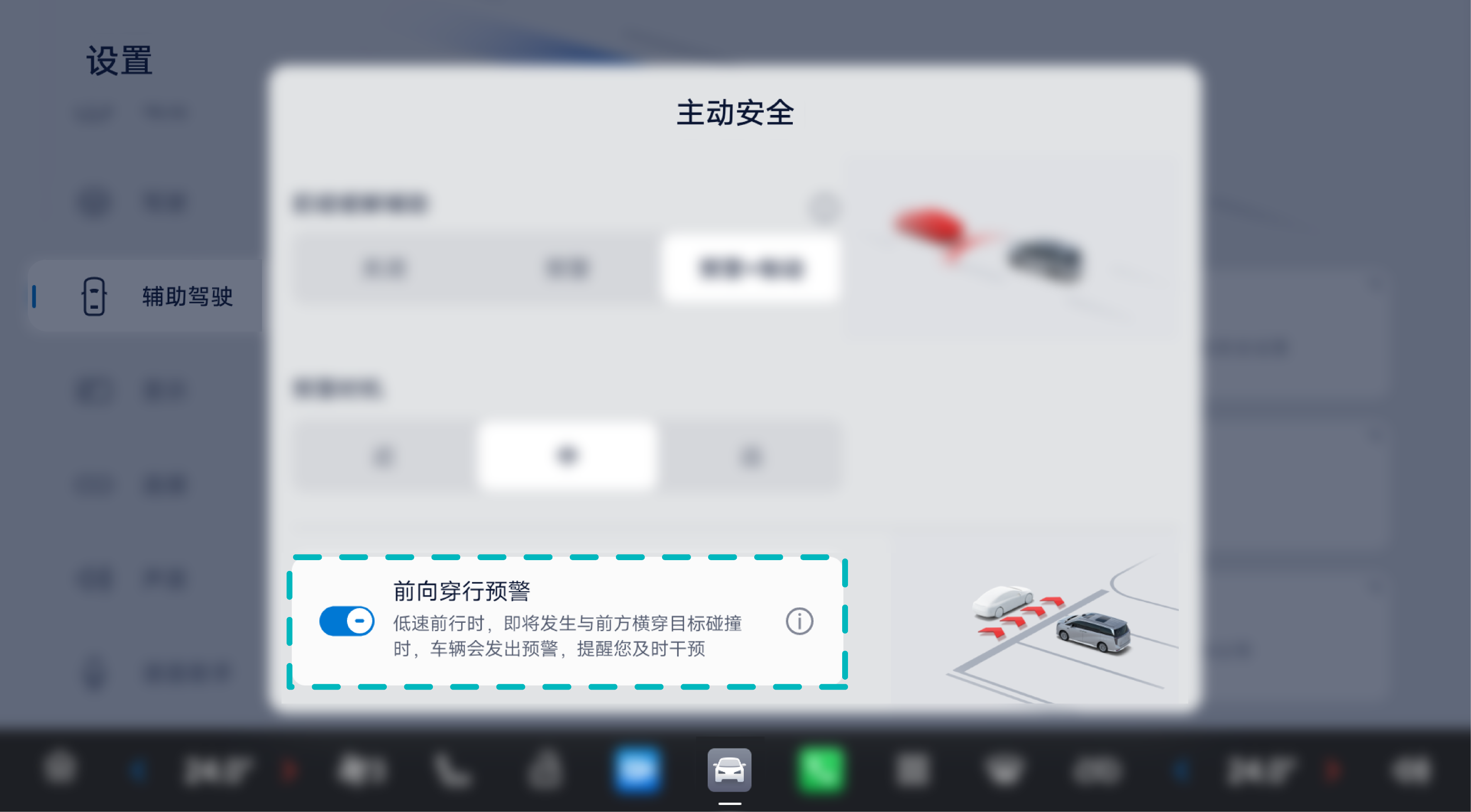 在中控屏进入“设置>辅助驾驶>主动安全”,设置开启或关闭前向穿行预警系统。