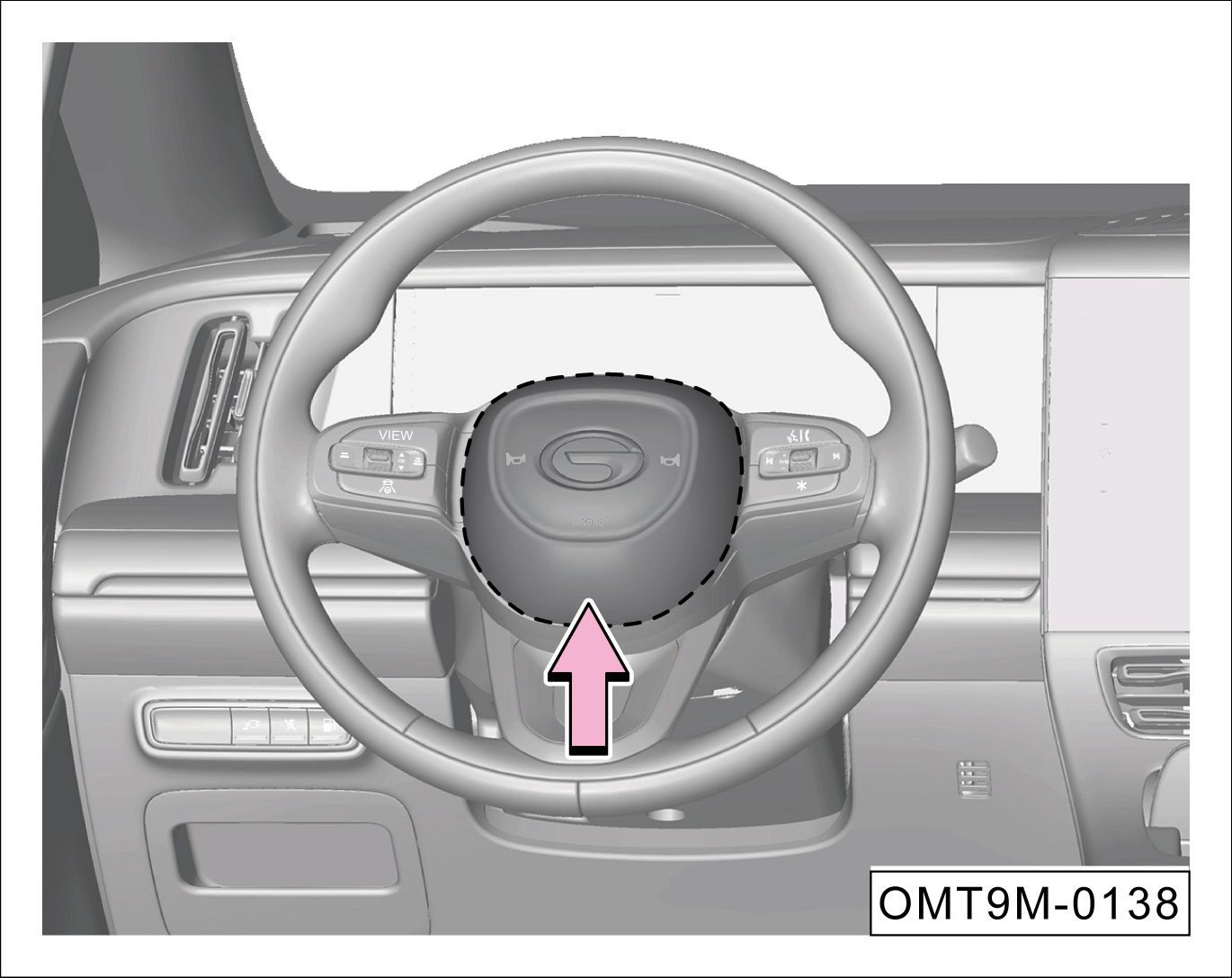驾驶员正面安全气囊安装在方向盘内部(虚线阴影部分),方向盘上标有“AIRBAG”字样。
