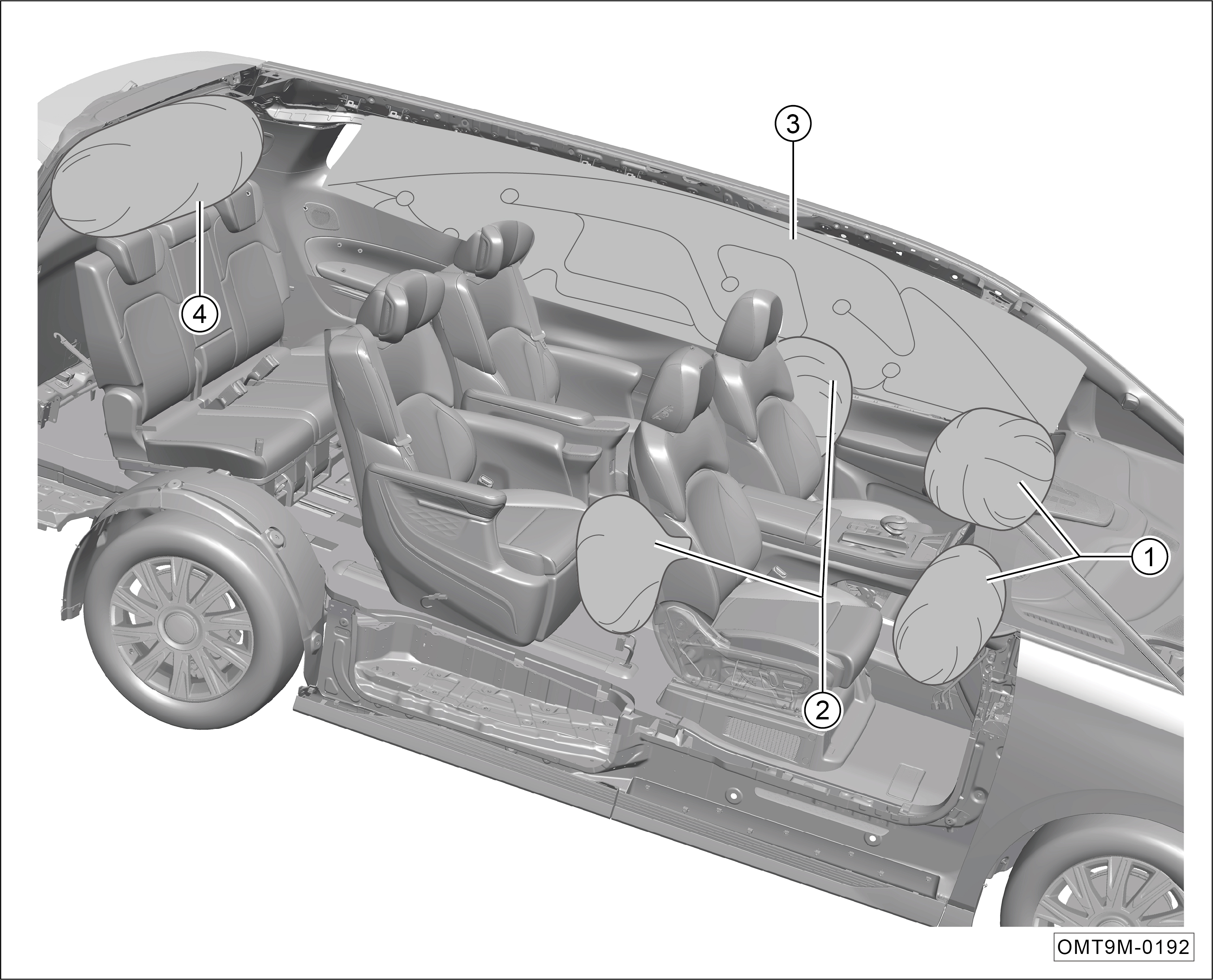 根据不同配置,安全气囊系统有以下膨胀示意位置: