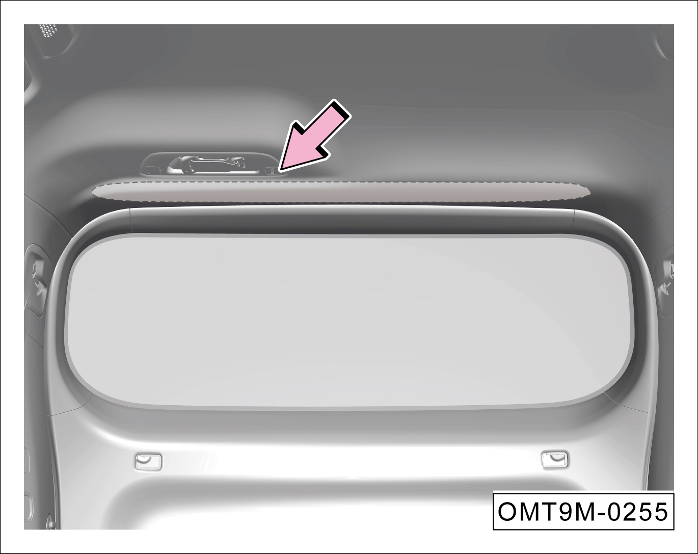 后风窗安全气囊安装在顶棚后方内部(虚线阴影部分),顶棚尾部饰板上标有“AIRBAG”字样。