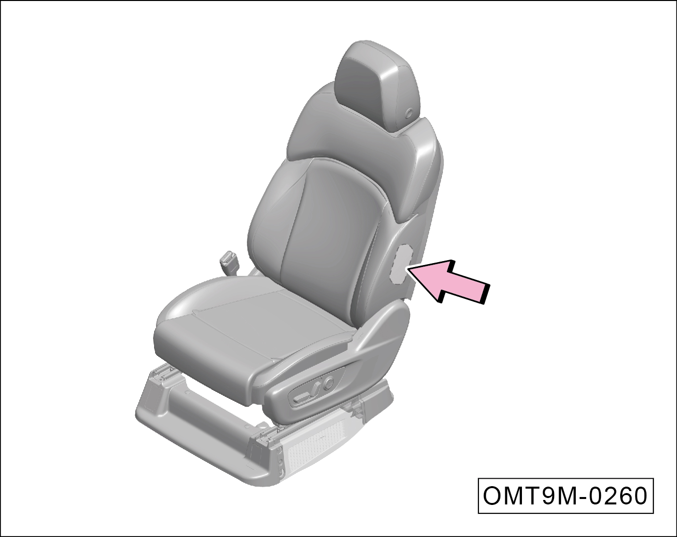 前排侧面安全气囊安装在驾驶员座椅及前排乘员座椅靠背向门侧内部(虚线阴影部分),前排座椅外侧标有“AIRBAG”字样。