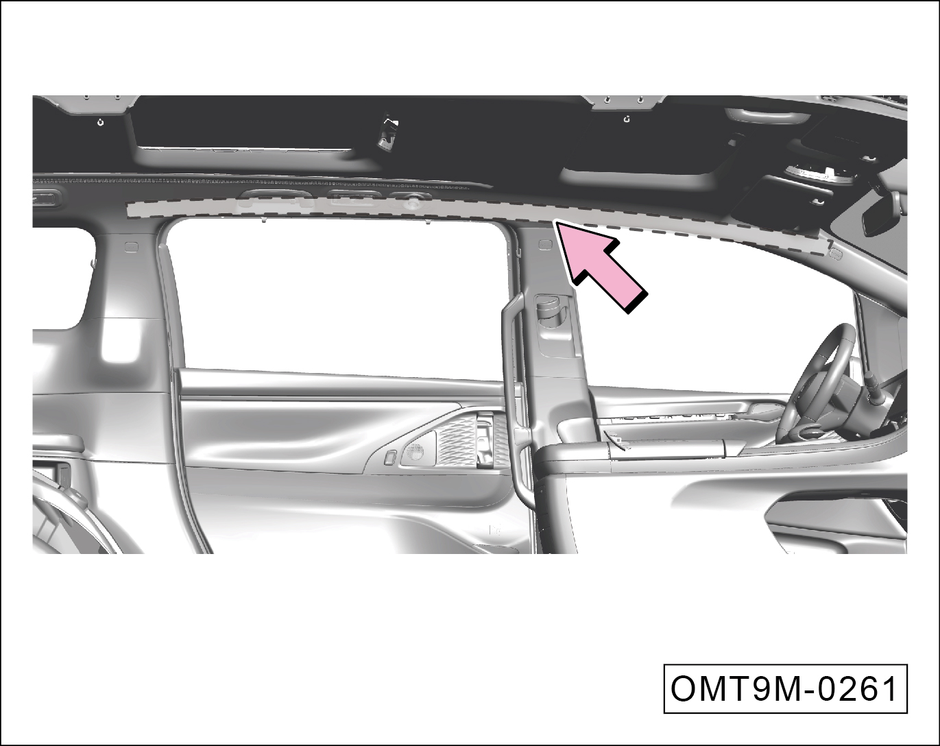 侧窗帘式安全气囊安装在顶棚左、右两侧内部(虚线阴影部分),顶棚两侧饰板上标有“AIRBAG”字样。