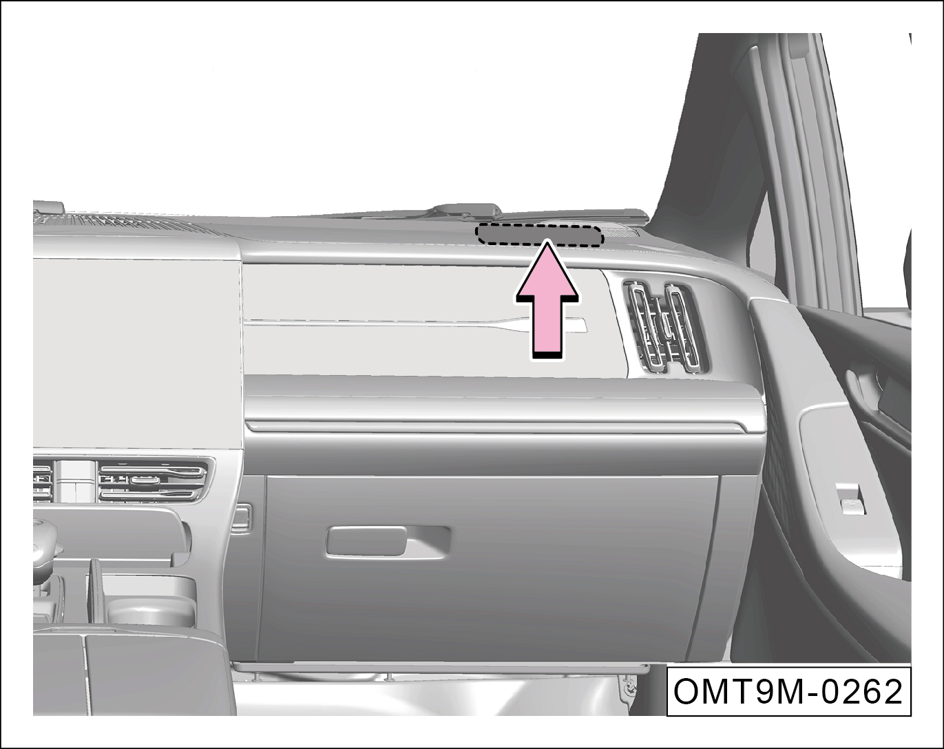 前排乘员正面安全气囊安装在仪表台内部(虚线阴影部分),仪表台右侧标有“AIRBAG”字样。